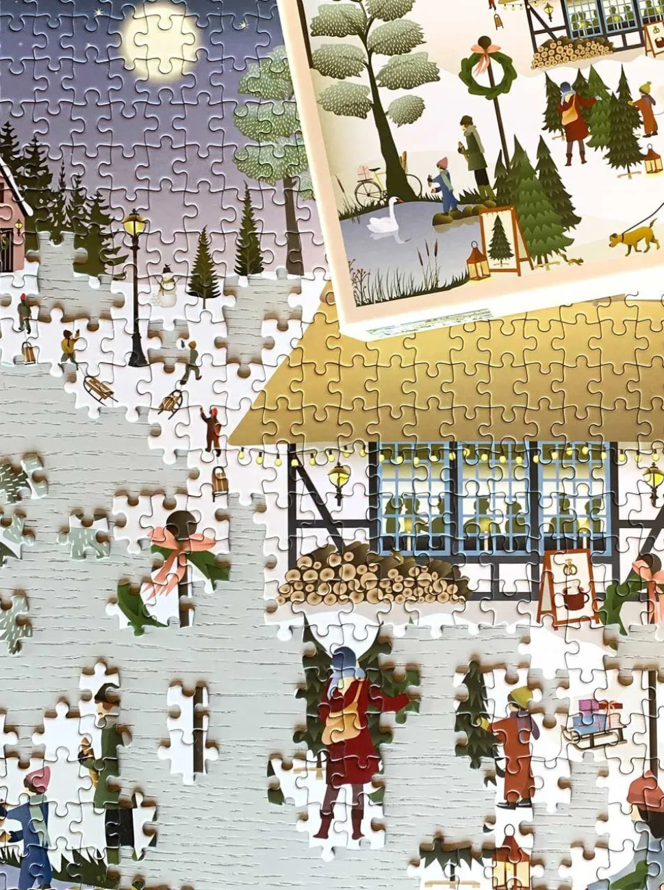 Julepuslespil med 1000 brikker fra danske ViSSEVASSE. Puslespillet er tegnet af Dorthe, som tegner alle ViSSEVASSES produkter.