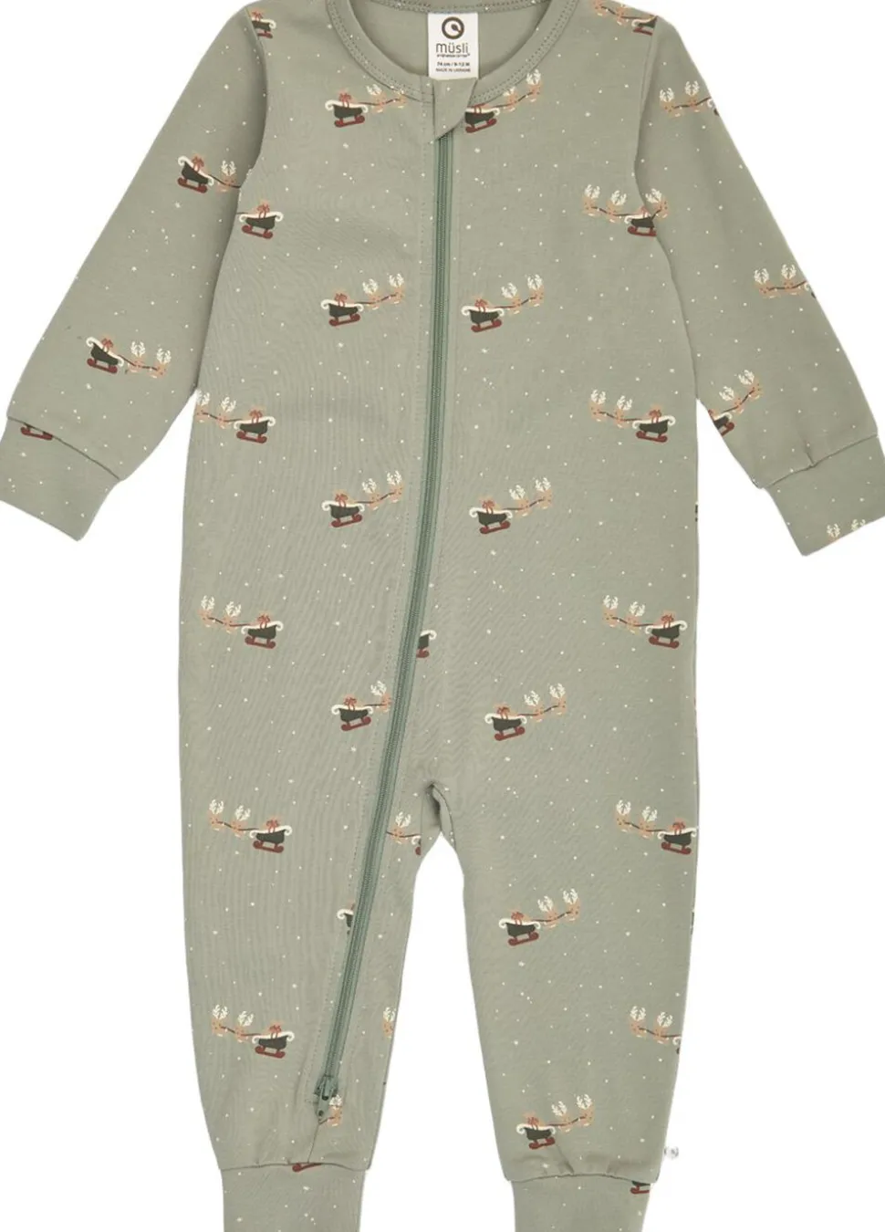 Julens MUST-HAVE Sød og fin heldragt med juleprint af rensdyr og julemandens kane. Dragten har en praktisk lynlås lukning ned igennem dragten for at gøre tøj og bleskiftet lettere for mor og far og mere behageligt for barnet. Dragten er fremstillet i blød og strækbar single jersey med elastan for at sikre god bevægelighed og en holdbar pasform. (GOTS Organic Certified by Ecocert Greenlife Lic. No. 151714). Produktet er GOTS organic- certificeret, hvilket betyder at bomulden er certificeret økologisk, og at der i alle andre processer som farvning, strikning og syning er taget de strengeste hensyn til miljøet. GOTS er internationalt anerkendt som den førende standard for forarbejdning af tekstiler af økologisk bomuld. Derudover tages der også hensyn til arbejdsforholdene, hos dem der producerer tøjet. Økologisk bomuld 95%, Elastan 5%
