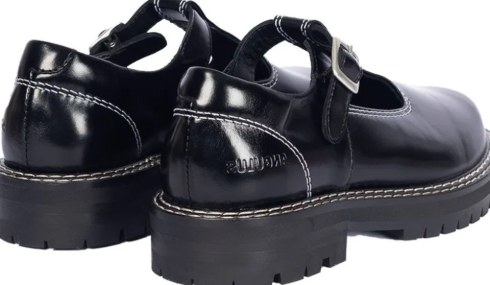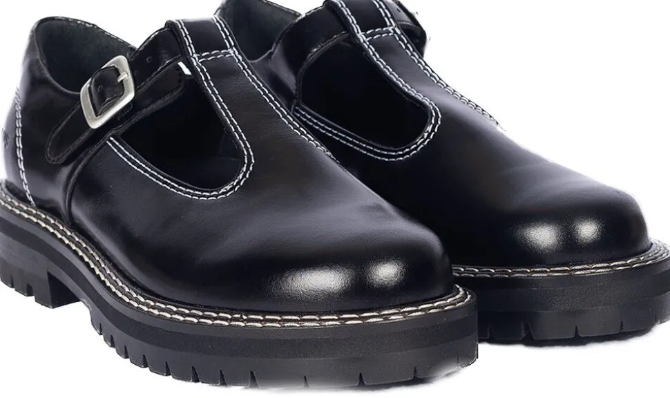 Chunky Mary-Jane i læder med dekorative kontraststikninger.