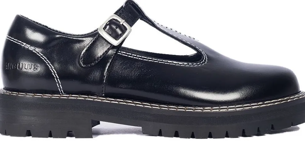 Skoen har en mandelformet snude, T-rem med justerbar spændelukning, polstret læderindersål, kromfrit læderfor, fast hælkappe og en chunky gummi tracksål med dekorativ rand.