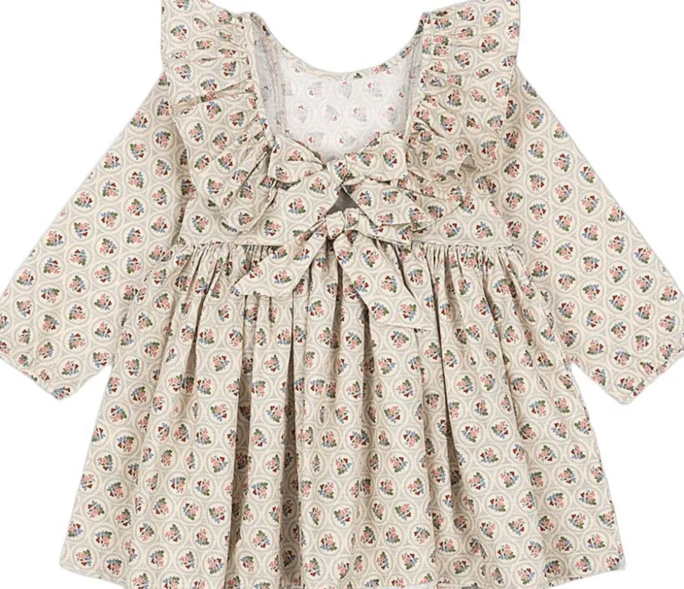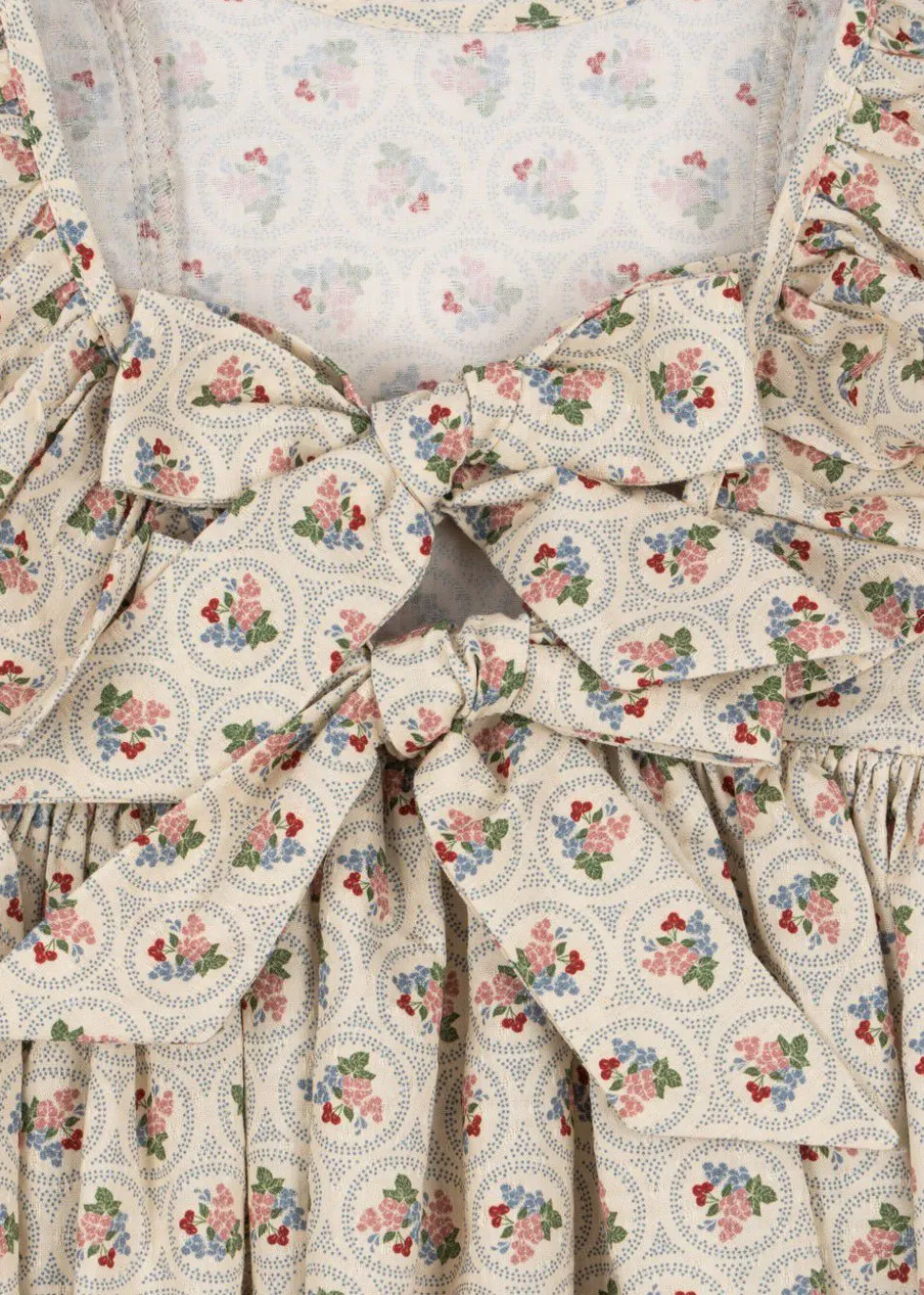 Soft organic cotton dress with frill details at the sleeves and bow details in the back.