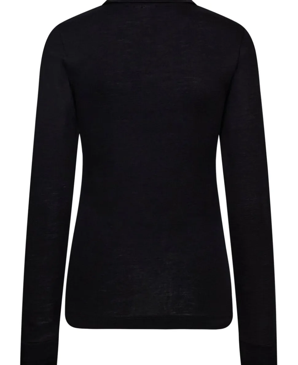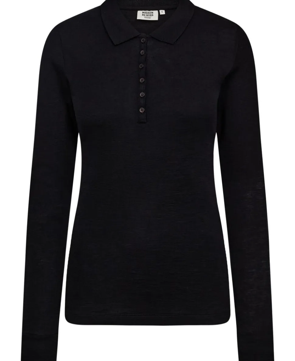 Langærmet polo fra Magasin du Nord Collection i den blødeste kvalitet af 100% uld med RWS- og OEKO-TEX® STANDARD 100-certificering. Blusen er enkel i modellen med en klassisk krave, knaplukning på brystet, lange ærmer med brede ribkanter samt en tætsiddende pasform. En elegant bluse i den lækreste kvalitet.