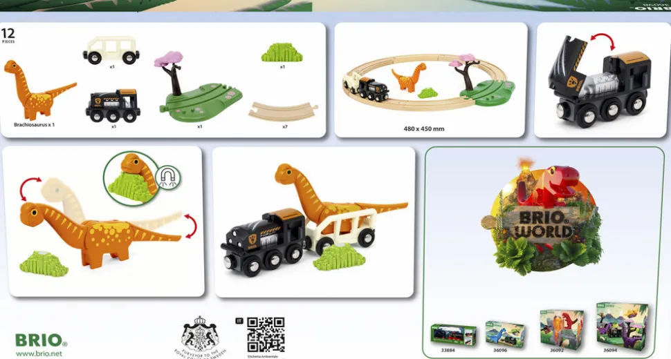 Togsættet indeholder 12 dele, bl.a. et dinosaurinspireret tog med vogn dinosaurfigur, en skinne med grøn eng og træskinner til at bygge cirklen. Fra 3 år