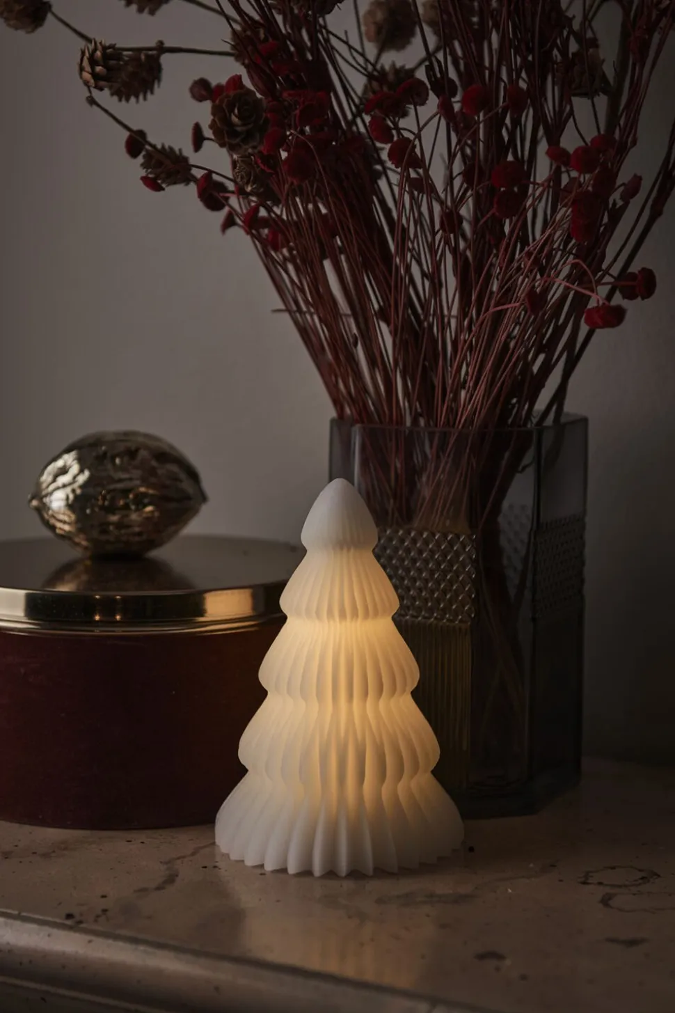 Sirius Claire Juletr¾ er en stilren og tidl¿s juledekoration i et unikt design. Dekorationen er formet i stearin, hvilket giver den et bl¿dt og organisk udtryk. Gennem stearinen lyser et pulserende LED-lys, og skaber varme og rolig atmosf¾re. Claire er Sirius nyfortolkning af et klassisk stykke julepynt. Giv dit hjem en sofistikeret juledekoration, du kan f gl¾de af r efter r. Sirius Claire juletr¾ er en del af en serie, inspireret af det klassiske stearinlys med flammens pulserende effekt, som velkendt hyggespreder. Vi har genskabt den hyggelige atmosf¾re, ved at give LED-lyset en pulserende og sprede varmt og roligt lys gennem stearinfladen. T¾nd og sluk dem manuelt eller brug Sirius Fjernbetjening, der kan k¿bes ved siden af. Med fjernbetjeningen kan du indstille tiden p enten 2,4,6 eller 8 timer.