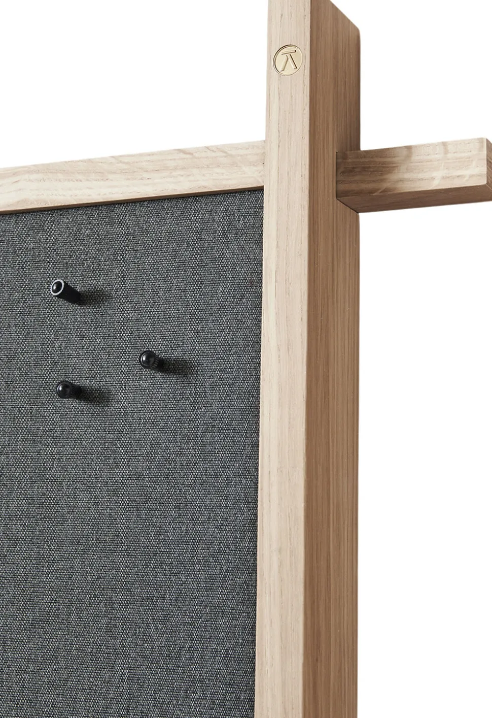 Mono Coat rack er designet med et simpelt og monotont udtryk, og det lyse egetræ tilfører varme og glød til indretningen. Mono Coat Rack tilbyder adskillige knage i en knagerække, hvor overtøj og bøjler hænges på knagen, ved at vippe en af knagerækkens pinde ned.
