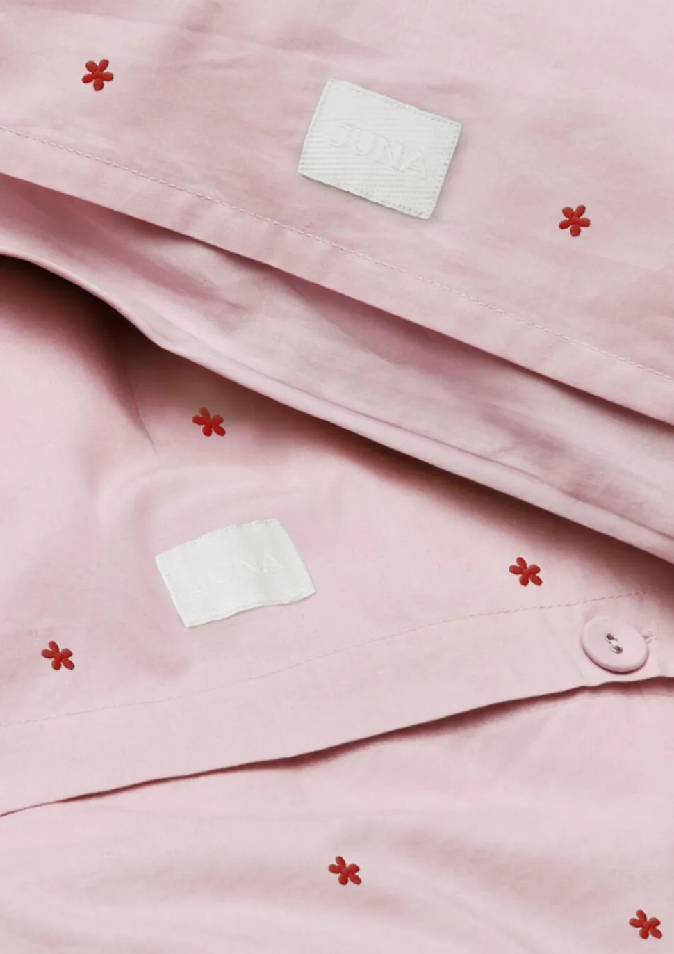 Små blomster til store drømme. Med Daisy-sengesættet fra JUNA får du en nyfortolkning af det klassiske blomsterprint, hvor en broderet blomst i kontrastfarve smukt og stilfuldt spiller sammen med JUNAs altid både enkle og moderne design. Sanseligt, behageligt og produceret ud fra ansvarlige principper. Sådan kender du sengetøjet fra JUNA. Og med Daisy-serien fortsætter JUNA i samme både vidunderlige og ansvarlige stil, hvor uendelige drømme lever og ånder side om side med en passioneret vision for ansvarlighed og cirkularitet nu og i fremtiden. Sengetøjet til almindelige dyner måler 140×200 cm, og i denne livlige lyserøde version med små broderede blomster i rød får du en modig og legende farvevariant med masser af hygge og varme. Daisy er fremstillet i 100% økologisk bomuld, der både er GOTS-certificeret og OEKO-TEX®-mærket, så du kan nyde en god nats søvn med god samvittighed. Og når du kommer helt tæt på Daisy-sengetøjet, vil du ud over detaljerne med de mange små margueritter også virkelig kunne se og mærke lækkerheden i den tætte og fine bomuldspercale, der giver stoffet en blød og glat tekstur. Samtidig med at være ekstrem behagelig at sove i får du med percalevævningen også et meget slidstærkt og holdbart sengesæt i en eksklusiv kvalitet, som du kan have glæde af nat efter nat og år efter år. Daisy-seriens hyggelige og klassiske vibe med et moderne tvist skaber en glad og drømmende stemning i soveværelset, i sofaen, i hængekøjen, på altanen, eller hvor du nu tager din dyne og pude med hen. Det er helt op til dig, og med de forskellige Daisy-sengesæt fra JUNA kan du jo sagtens mixe og matche farver på dyner og puder på kryds og tværs og skabe din helt egen stil. (GOTS Organic Certified by Control Union, CU1026087)