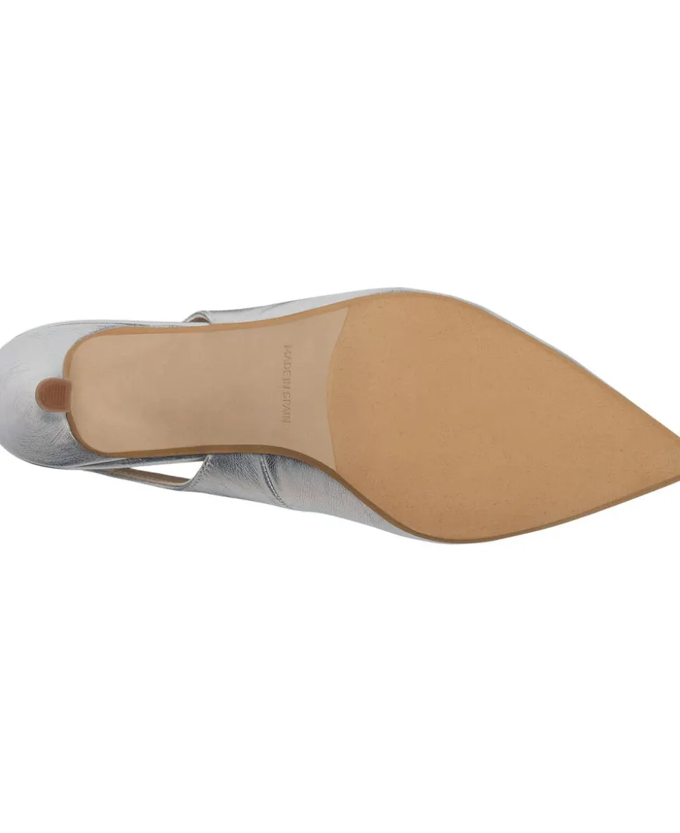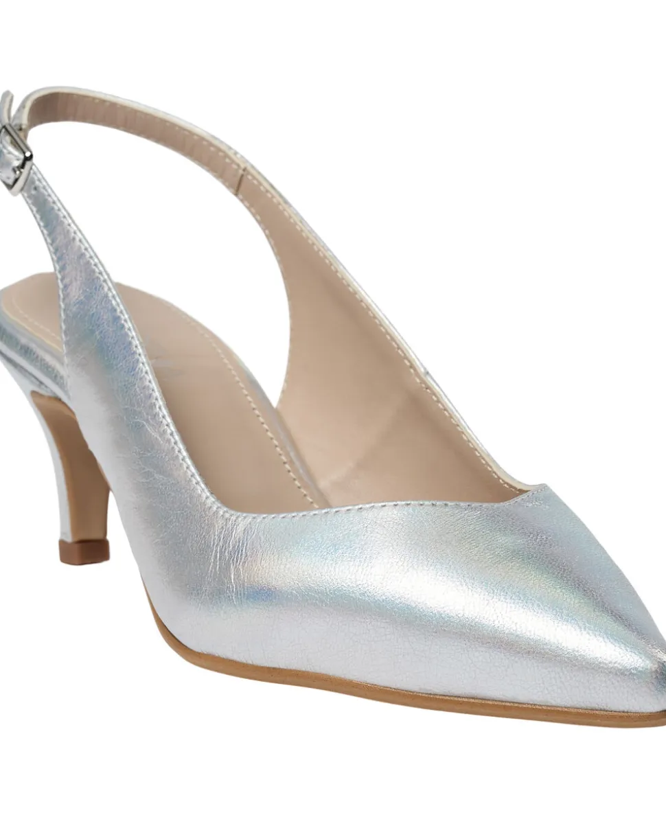 Sling back-pumper med spids tå, lavet af læder. Pumperne har en tynd justerbar strop omkring hælen, som lukkes med et lille metalspænde. Vores Dakota slyngepumper er lavet med en højde, hvilket betyder, at du kan bruge dem både til hverdag og fester. Materiale Læder Farve Sølv hæl 6 cm Størrelsesguide Normal
