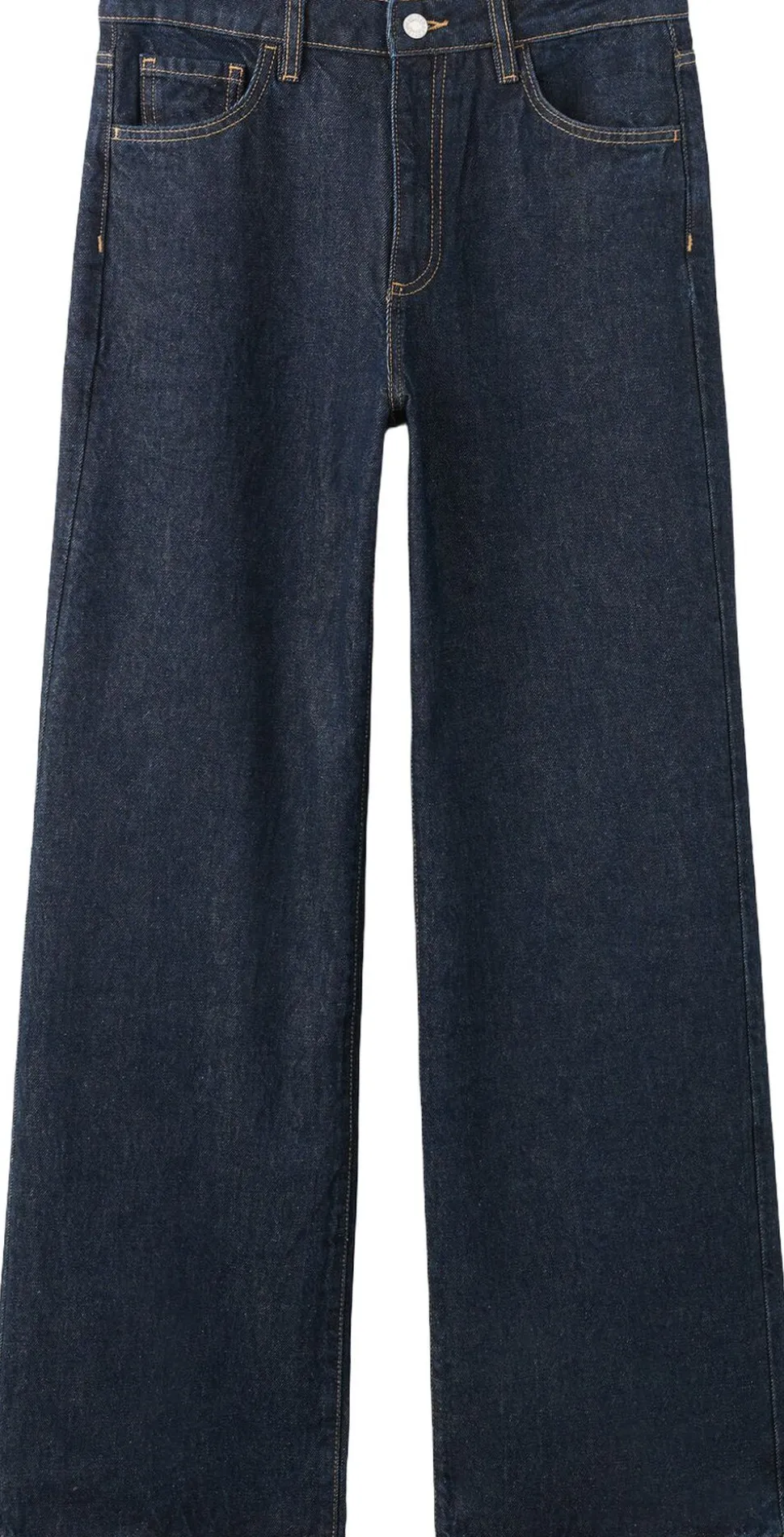 Fås Plus, fem lommer, lynlås- og knaplukning, indvendig længde 84. 5 cm, lang længde, Silhouette Brede ben, høj talje, bomuld i denimstil, langt Design, brede benDesign høj talje, bæltestropper.