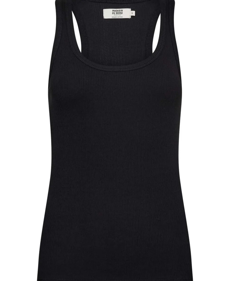 Tanktop fra Magasin du Nord Collection i den blødeste kvalitet af 93% økologisk bomuld med GOTS-certificering. Toppen har en ribstrikket struktur, der giver en skøn, tætsiddende pasform, en rund halsudskæring samt brede skulderstropper med bryderryg. En casual tanktop, der er et musthave i basisgarderoben.