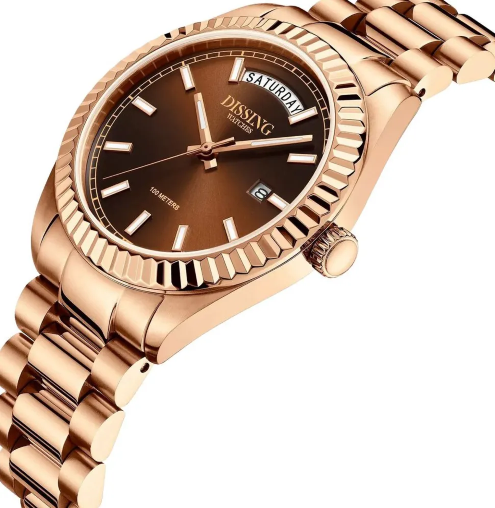 Dissing Day Date D1725 uret kombinerer klassisk stil med praktisk funktionalitet. Det har en rund urkasse med en rillet bezel, der indrammer den brune urskive og giver det et karakteristisk udtryk. Dag- og datovisningen er placeret øverst, mens et mindre datovindue sidder på højre side. Rektangulære timemarkører og matchende visere forbedrer det samlede design. Uret er udstyret med kvarts urværk.