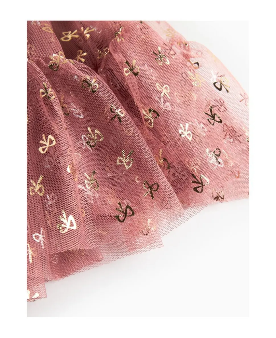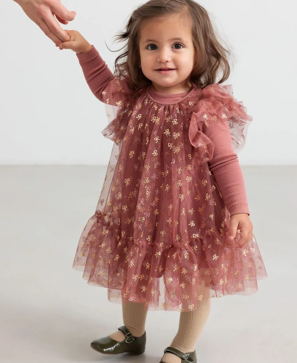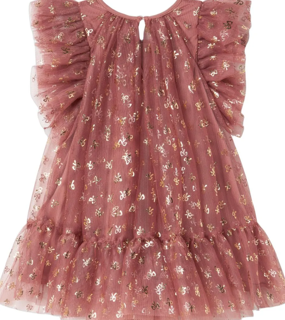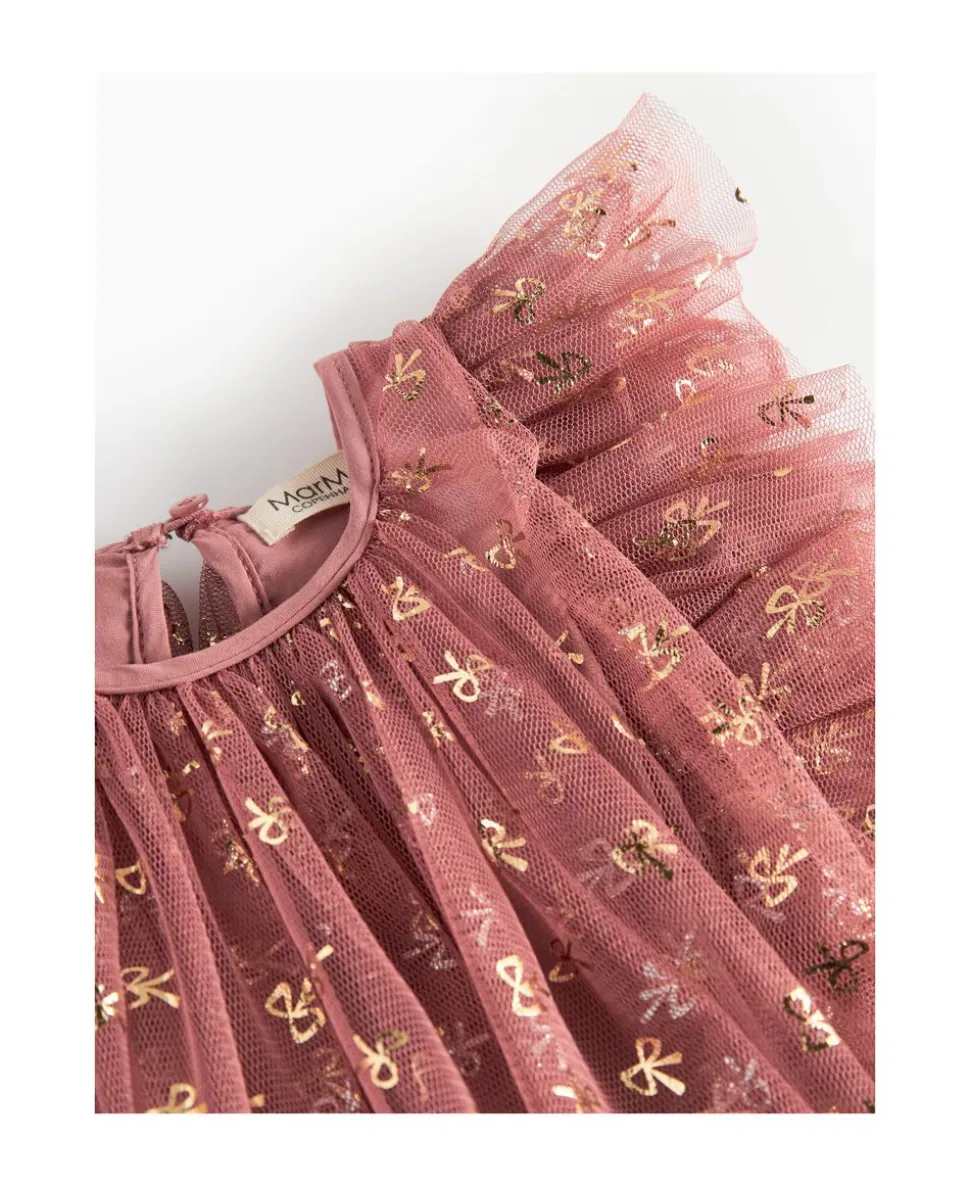 Fin og festlig kortærmet kjole med mange lag tyl for volumen. Kjolen er pyntet med guld sløjfer, har flotte tylflæser på ærmerne og lukkes med knaplukning bagpå. Kjolens længde går til over knæene.