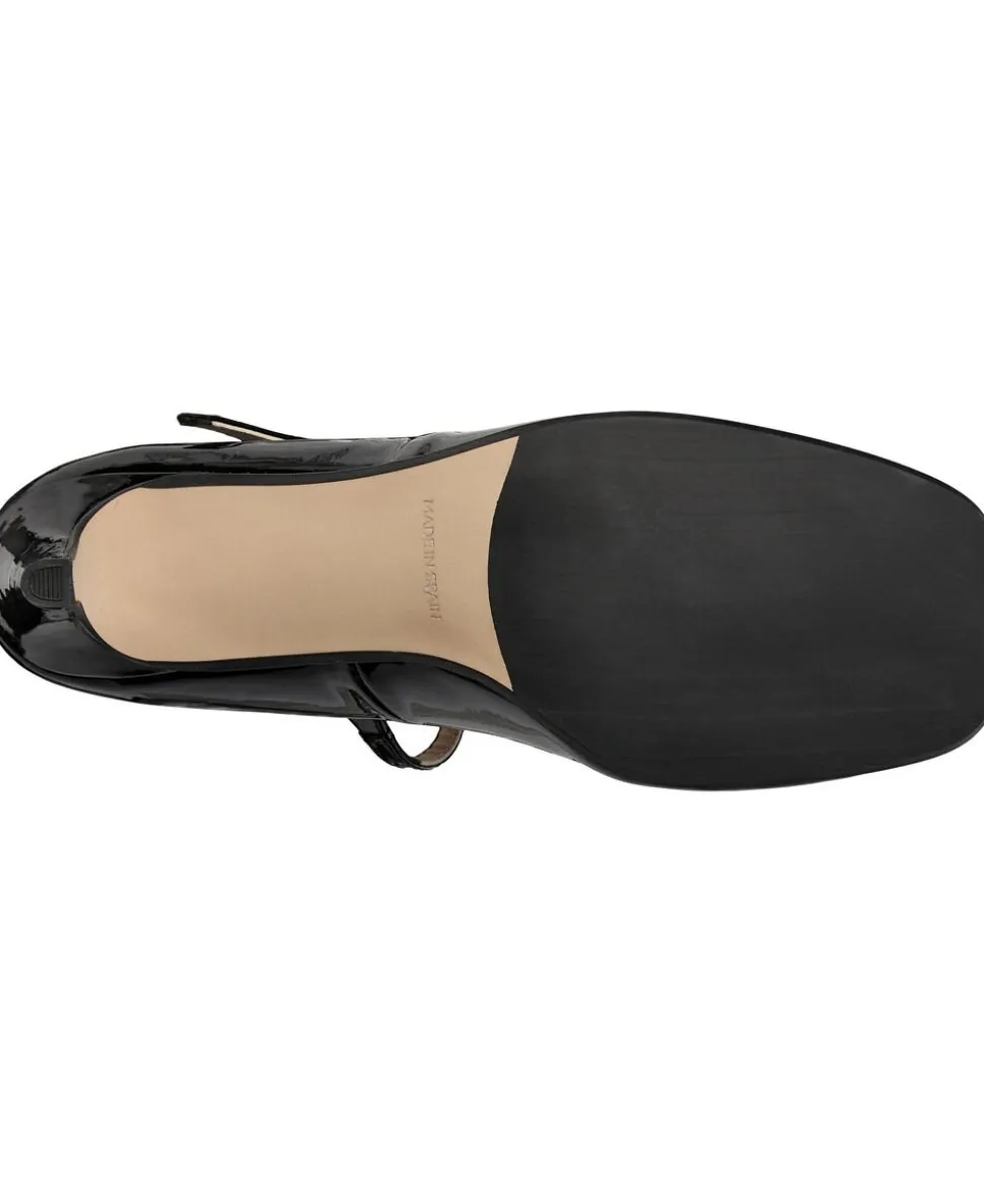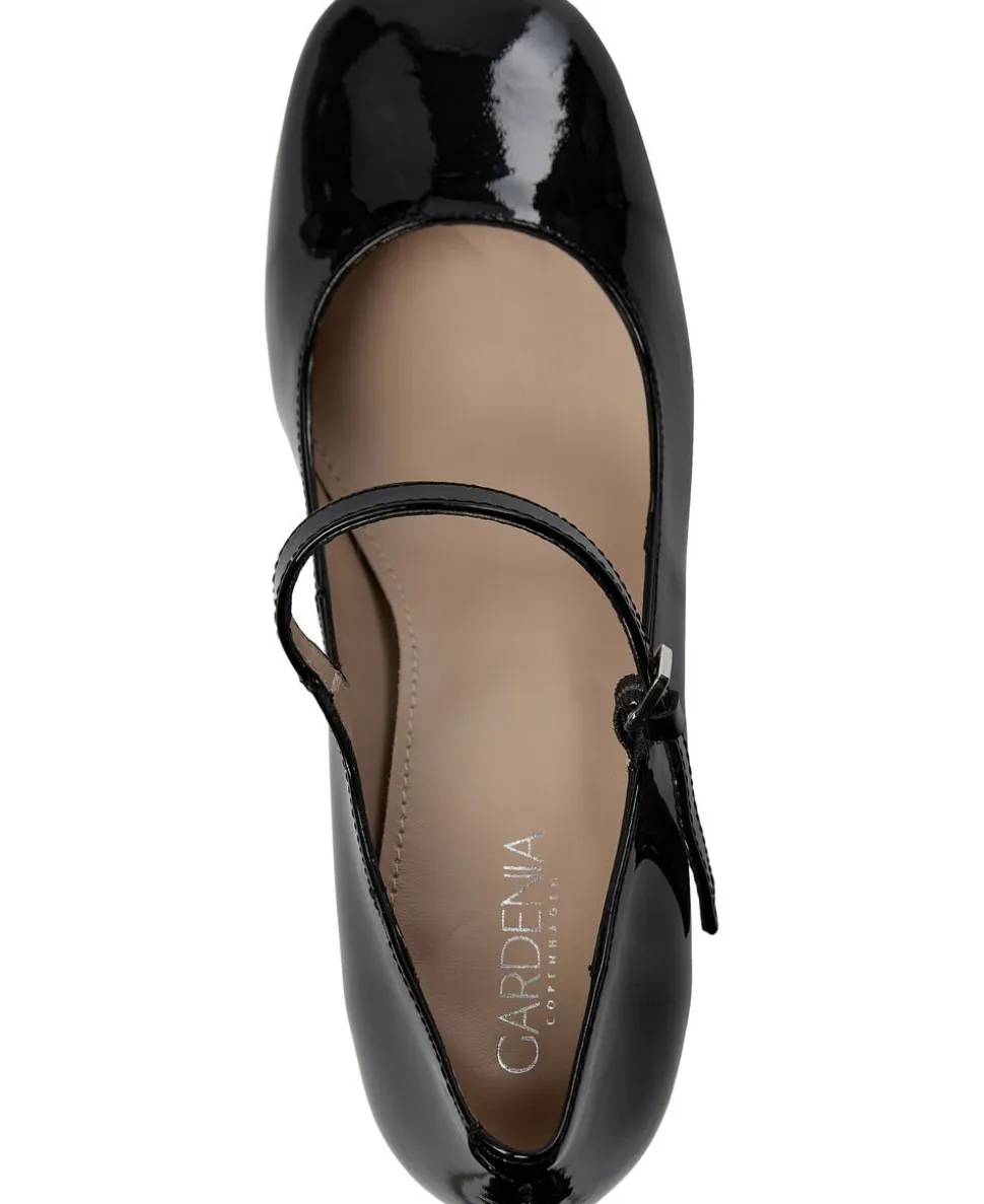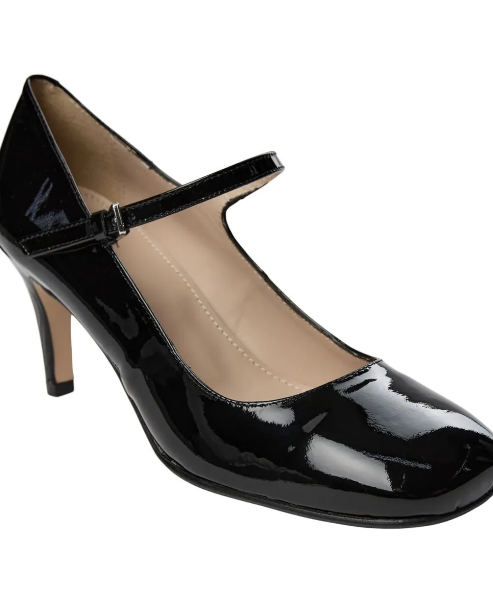 Elegante pumper lavet af patentlæder med en firkantet tå og en justerbar strop på overfoden. Materiale Patent Læderfarve Sort hæl 7 cm Størrelsesguide Normal