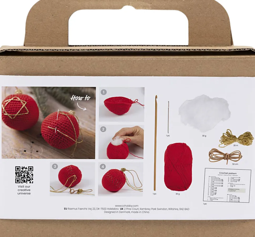 Med dette kit kan du hækle bløde julekugler af garn. Indeholder alle de materialer du skal bruge, og al den vejledning du behøver. Drømmer du om hjemmehæklet julepynt, er dette kit perfekt. Med bomuldsgarn og bamsefyld kan du lave de blødeste julekugler. Skal julekuglerne være ekstrafine, kan du også brodere motiver i guldtråd udenpå fx snefnug, stjerner eller striber. Opskriften er både med ud- og indtagning så hvis du allerede hækler lidt i forvejen, er det en fin udfordring.