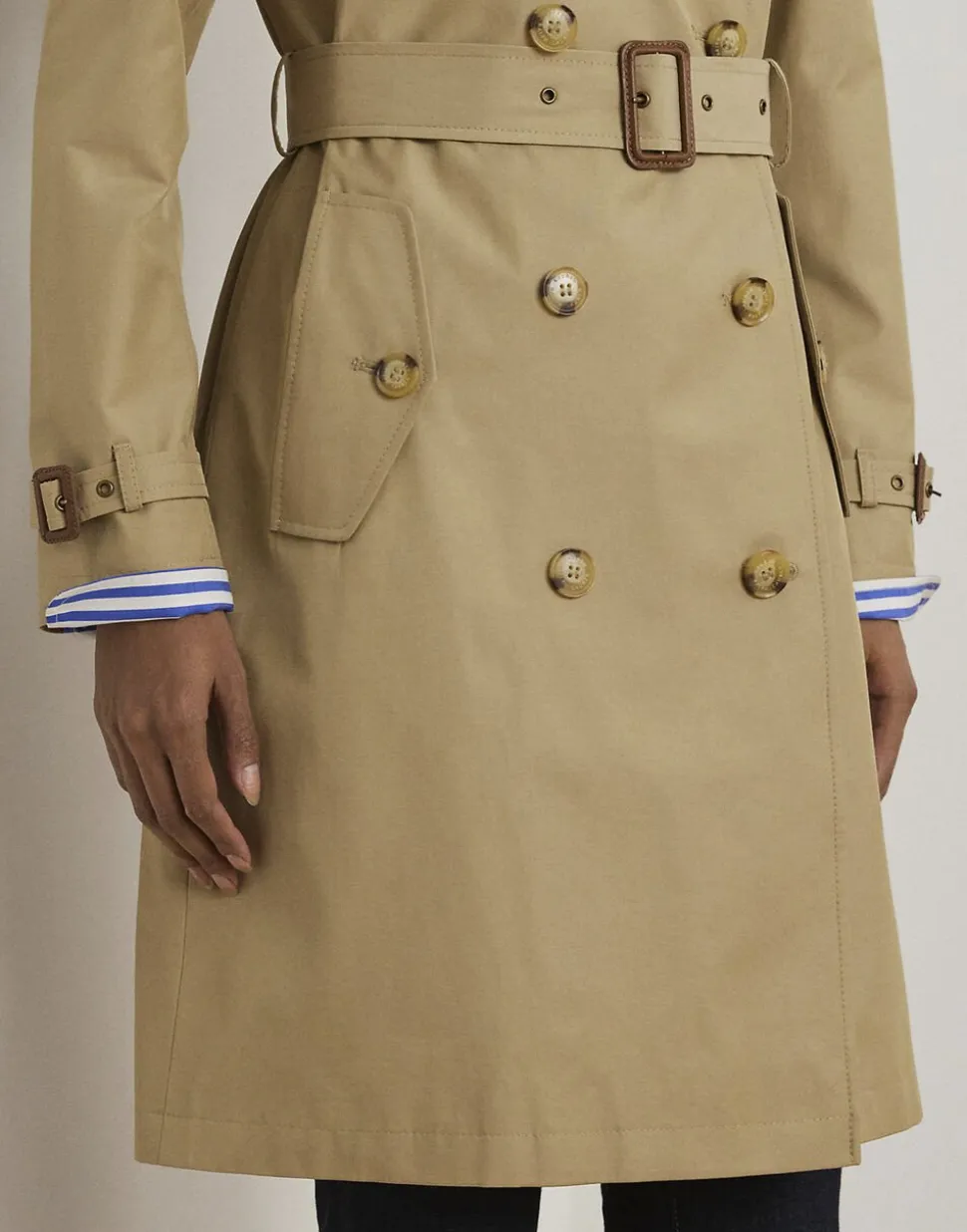 Laurens fortolkning af trenchcoaten er fremstillet i en blød bomuldsblanding og har traditionelle Styling-detaljer, herunder en dobbeltradet silhuet og skulderepauletter med knapper. Et selvbælte med spænde fremhæver taljen, mens “Lauren Ralph Lauren”-indgraverede knapper med horneffekt giver en signaturfinish.
