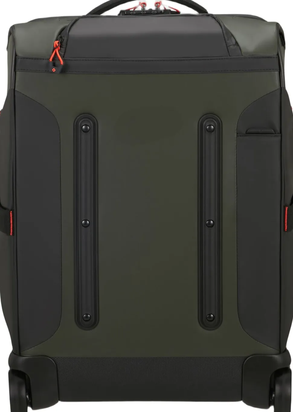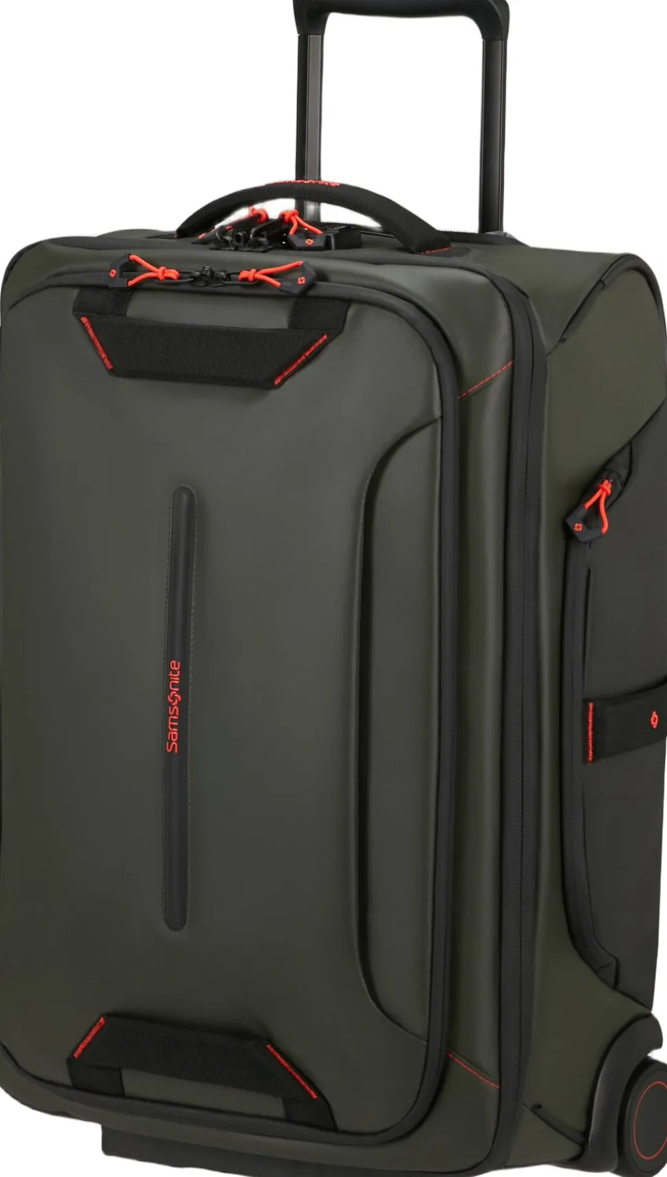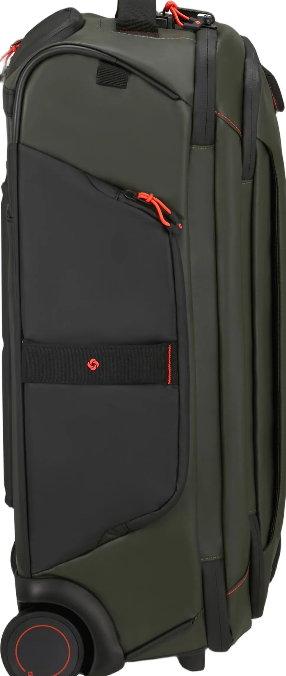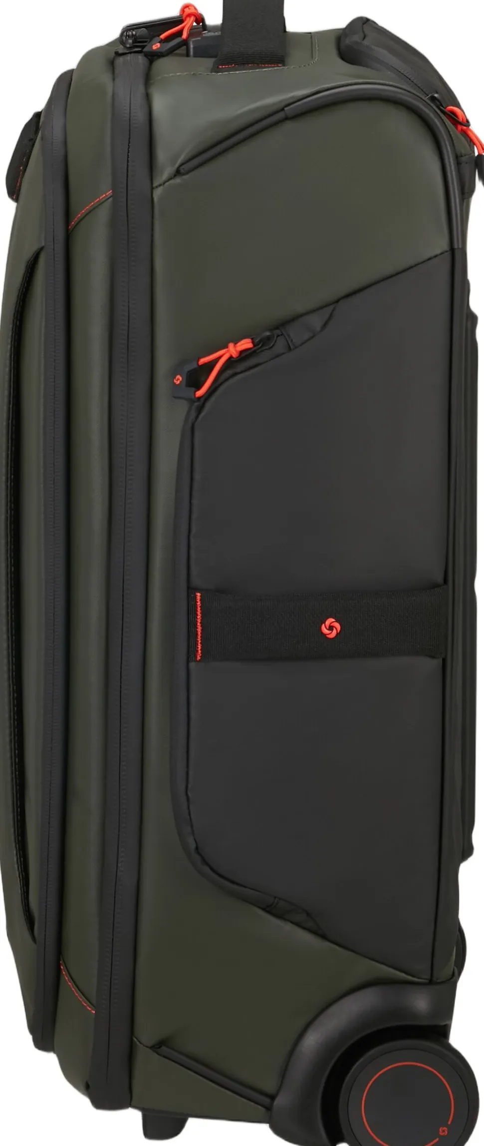Duffle på hjul der passer til de fleste flyselskabers kabinemål 40x55x20 cm. både det udvendige og indvendige stof er lavet af genbrugt nylon og polyester, vandafvisende materiale, front og sidelomme, TSA lås, rumindhold 48 liter, vægt 2,5 kg. 5 års begrænset garanti.