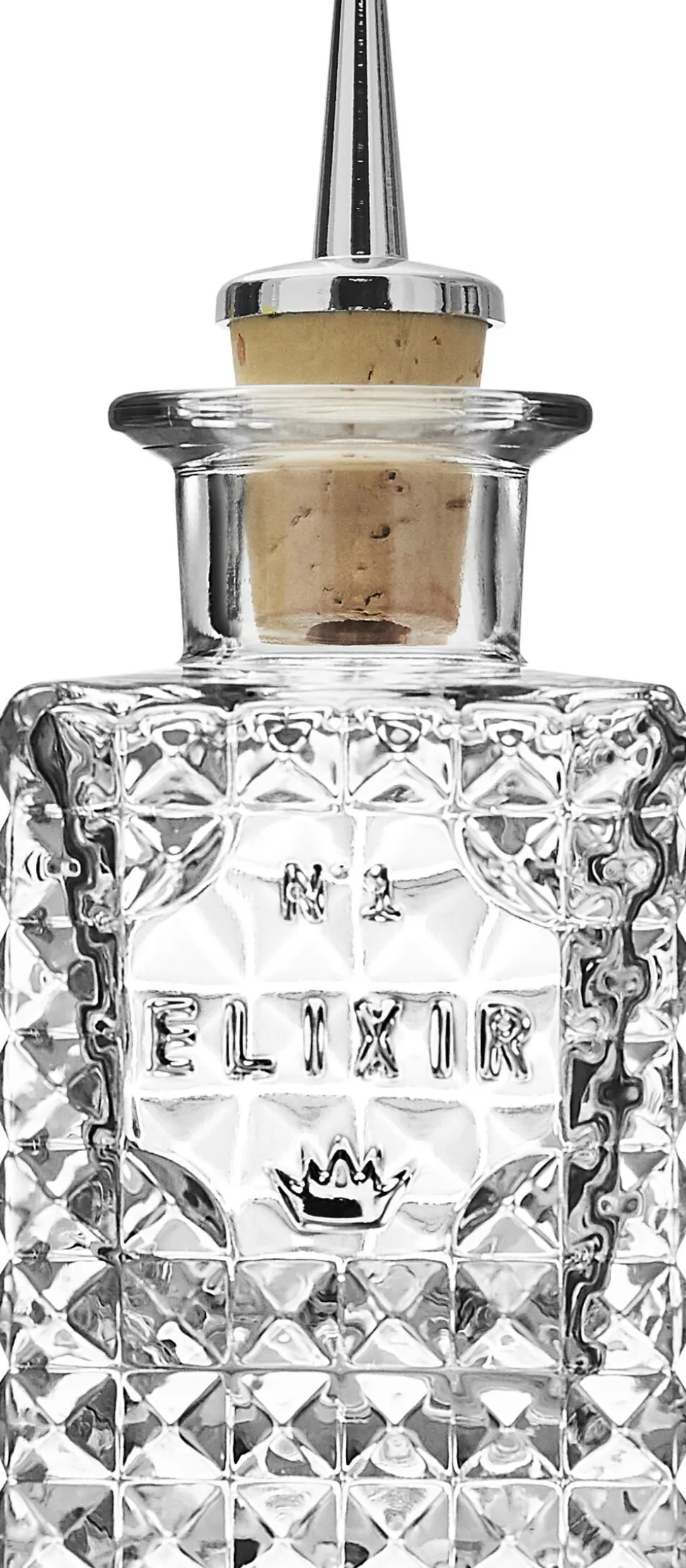 Elixir flaske med skænkeprop fra italienske Luigi Bormioli. Bruges til at tilsætte aroma til drinks, saucer og desserter. Flaskerne har skænkeprop til at hælde den helt rigtige mængde og et smukt facetteret glas med tekst. Alle Luigi Bormioli glas tåler maskinopvask ved max 55° C. 2 års garanti.