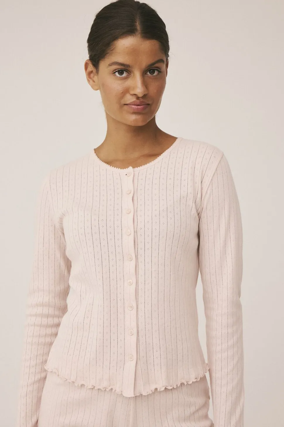 Cardigan fra Magasin du Nord Collection i den blødeste kvalitet af 100% økologisk bomuld med GOTS-certificering. Cardiganen har det fineste pointellemønster, der giver materialet et let, luftigt og dekorativt udtryk. Derudover har cardiganen lange ærmer, blondekant i den runde halsudskæring samt elegante bølgekanter. En skøn cardigan i den lækreste kvalitet.