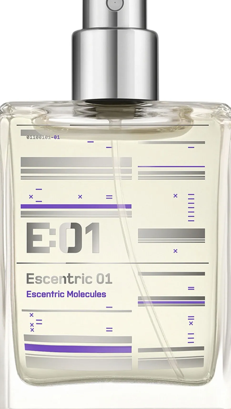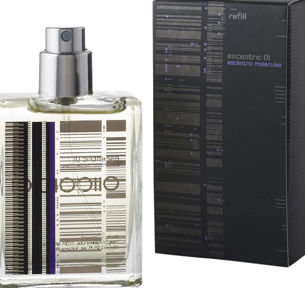 Escentric 01 refill er højt koncentreret med hele 65% Iso E Super sammen med bl.a. pink peber og grøn lime i en ny balanceret form. Hellere end den traditionelle duftformel af top, – hjerte – og bund noter, bevæger Escentric 01 sig hurtigt fra top til bund og bliver længere i den basale duftnote, som skifter imellem sanselige og varme træagtige duftnoter. Det er som om at Escentric 01 intet hjerte har, men en enorm sjæl! Næsen bag duften, Geza Schoen har skabt Escentric MoleculeS sammen med Londons branding eksperter fra ThisCompany. Inspireret af duftens sanselige og naturvidenskabelige natur, resulterede designet i matematiske binære koder og molekylær grafik.