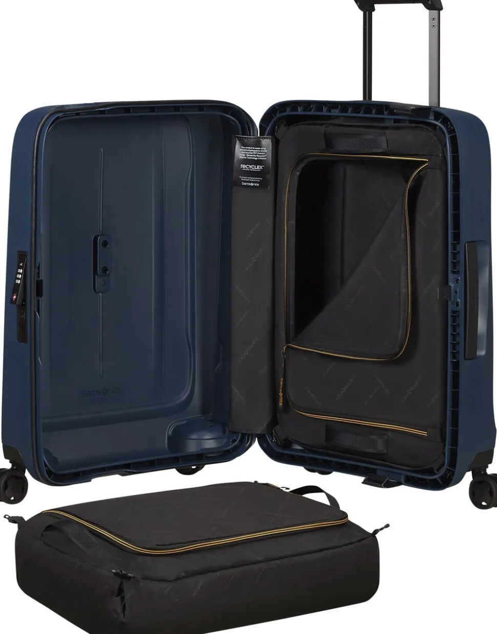 Kabinekuffert med 4 hjul, lavet af minimum 70% genbrugt polypropylen, stoffet indvendigt er lavet af genbrugte pet flasker,3 punkts TSA lås, dobbelt trollystativ, 2 aftagelige pakkeposer,2.6 kg,navneskilt,rumindhold 39 l, 5 års garanti