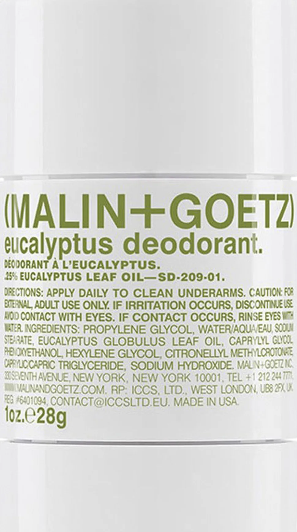 Malin+Goetz Eucalyptus Deodorant er anti-perspirant og er syntetiseret med forfriskende, naturlig eukalyptus ekstrakt og lugt-neutraliserende citronellyl, der virker effektivt i 24 timer. Malin+Goetz Eucalyptus Deodorant er egnet til alle hudtyper, især sensitiv hud, og blandingen er sammensat således, at den absorberes uden farvning af tøjet, irritation og tilstopning af porer. Malin+Goetz Eucalyptus Deodorant har naturlig duft og farve, og er fri for aluminium og alkohol.