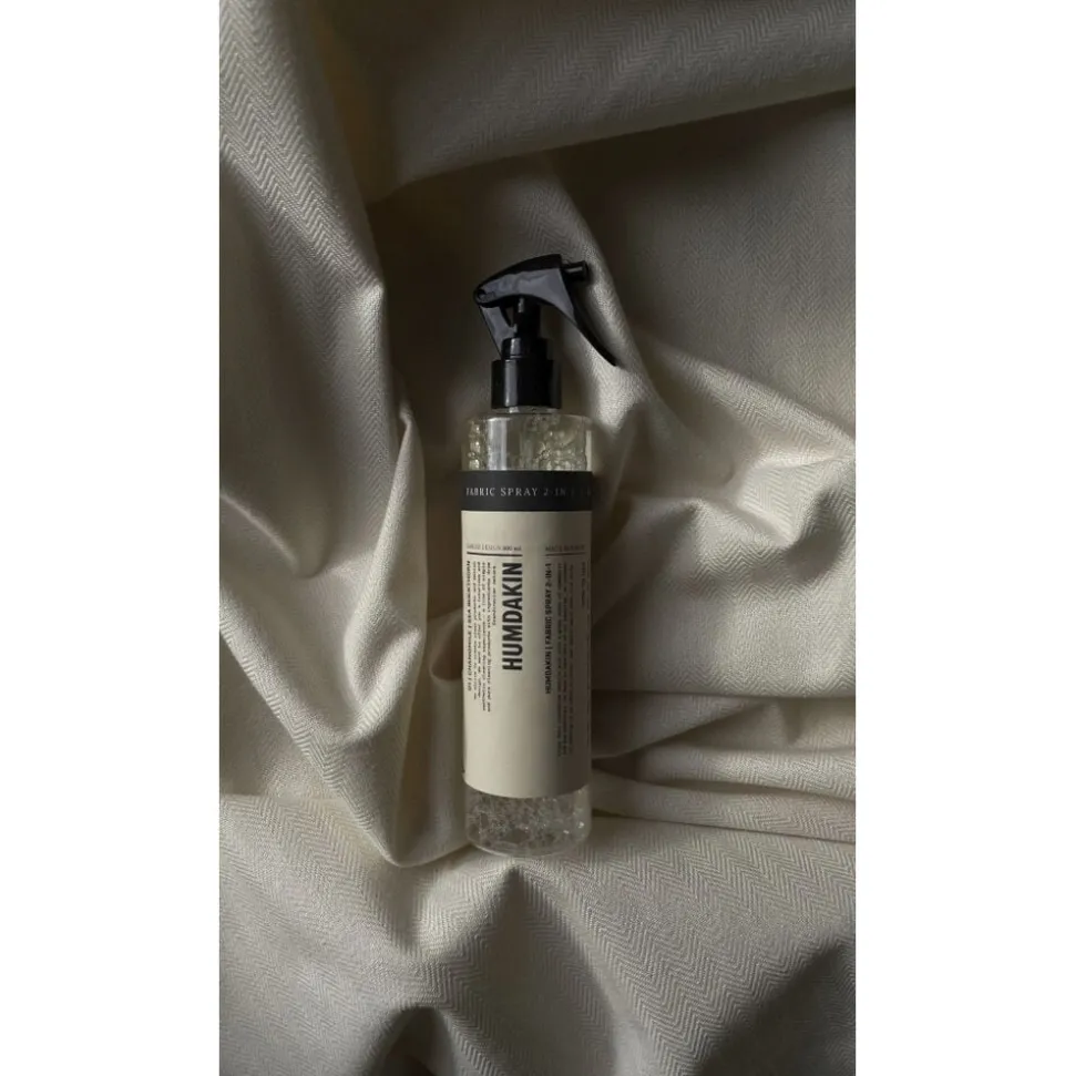 FABRIC SPRAY 2-IN-1 Chamomile and Sea Buckthorn – 300 ml pH range- 5,0 – 7,0 Enjoy this innovative fabric spray with a great scent of our signature scent, 01 with chamomile and sea buckthorn, which you can also find in our 01 laundry products. The spray is efficient and innovative as it both removes bad odeurs and adds the lovely, fresh and mild scent of chamomile and sea buckthorn. Take care of your textiles and the environment and delay the need for washing by using this spray once in a while. Use it for your clothes, bed sheets, your Humdakin textiles for kitchen and bath or curtains and other textiles. The only limit is your imagination. Directions for use- Always test on a not noticeable place on the textile in question. Spray directly onto the textile in need of freshening. PLEASE NOTE- The Fabric Spray not a substitute for washing your clothes, bedsheets or any other type of textile, but can be used to postpone a wash and/or extend a textiles freshness. Ingredients- 2-acetyl-1,2,3,4,5,6,7,8-octahydro-2,3,8,8-tetra-methylnaphtalene (main isomer), Linalyl acetate, Delta-Damascone.