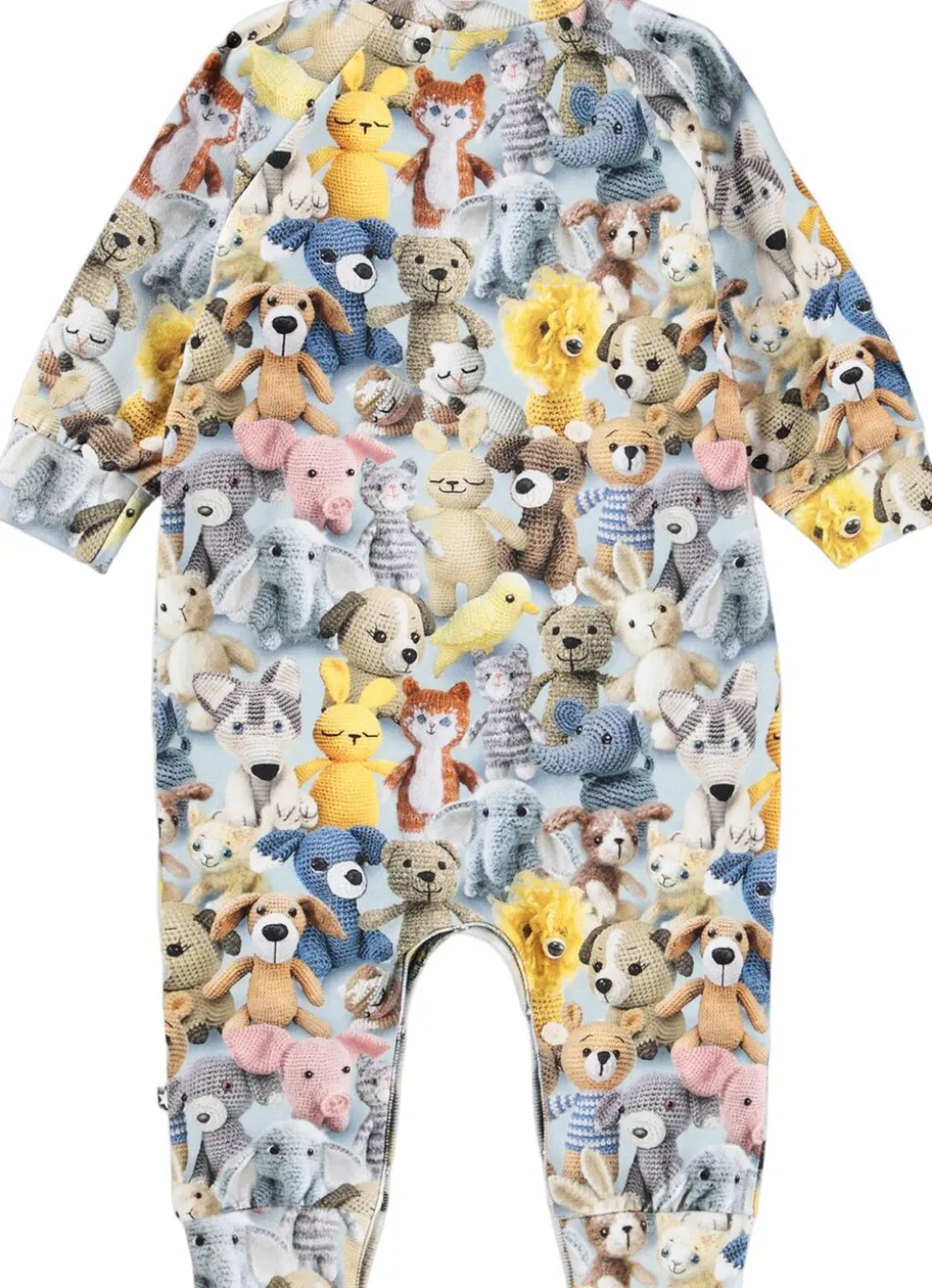 Denne heldragt fra Molo er lavet i økologisk bomuldjersey. Dragten har lange ærmer og ben, trykknapper på den ene skulder og mellem benene, samt ribkanter i ærmerne og benene.