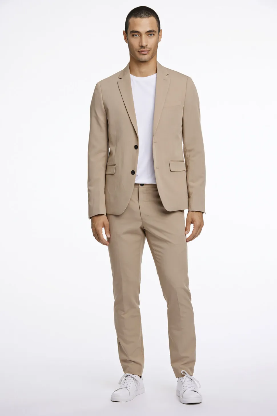 Bukserne er klassiske habitbukser, som lukkes med knap og skjult lynlås. Der er pressefolder, som gør looket ekstra stilfuldt, og bukserne har lommer i siden og paspolerede baglommer med knapper.