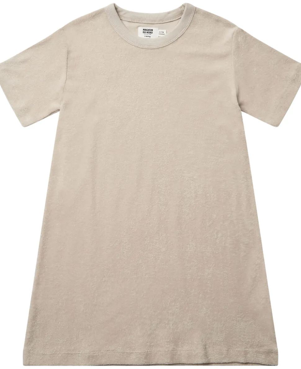 Kjole fra Magasin du Nord Collection i den blødeste kvalitet af 100% økologisk bomuldsfrotté med GOTS-certificering. Kjolen er enkel i modellen med korte ærmer, rib i den runde halsudskæring samt en casual, løs pasform. En skøn kjole i en lækker kvalitet.