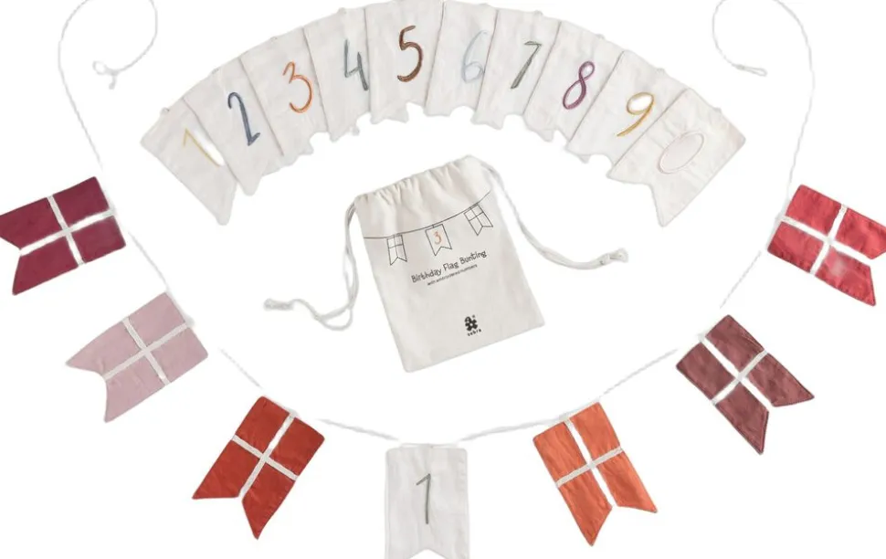 Fødselsdage er noget særligt, og den søde flagranke er perfekt til at fejre alle fødselarer i familien. Flagranken består af 6 dannebrogsflag fremstillet af økologisk bomuld i afstemte røde nuancer samt 11 flag med tallene fra 0 til 9 broderet på. Der er et ekstra 1-tal i den medfølgende opbevaringspose, så 11-års fødselsdagen også kan fejres.