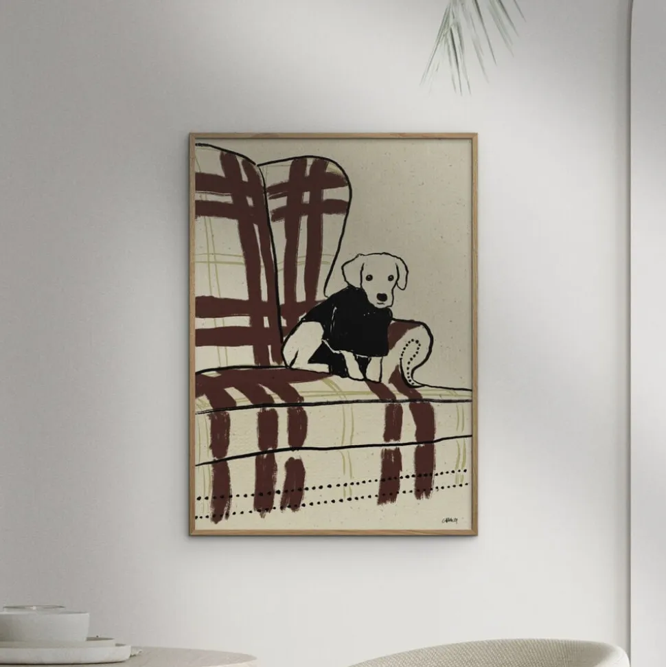 Charmerende kunstplakat med en sød hund i en klassisk stol, der bringer hygge og personlighed til din væg. Perfekt til hundeelskere