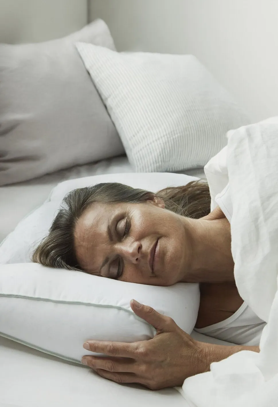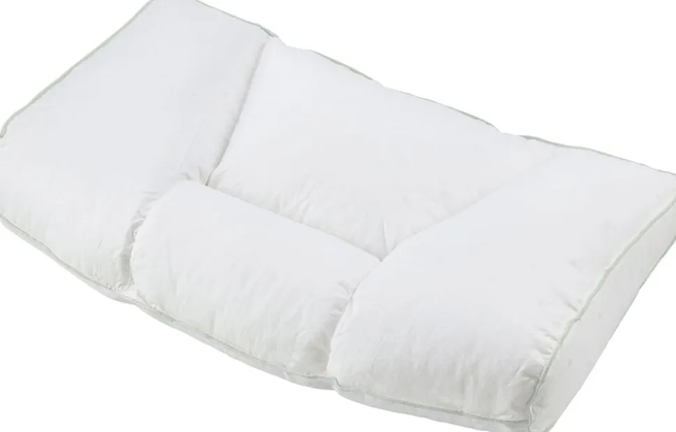 Sover du på siden, udfylder de høje sidekamre hulrummet mellem hoved og madras, mens underkanten af afrundet, så der er plads til skuldrene. Ligger du på ryggen, vil du mærke, at der er mindre fyld under baghovedet, hvilket strækker din nakke let og understøtter dens naturlige kurve.