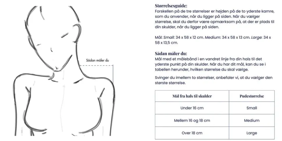Se størrelsesguide for at finde den pude der passer bedst til dig. Hovedpudebetræk i 100% bomuldssatin medfølger.