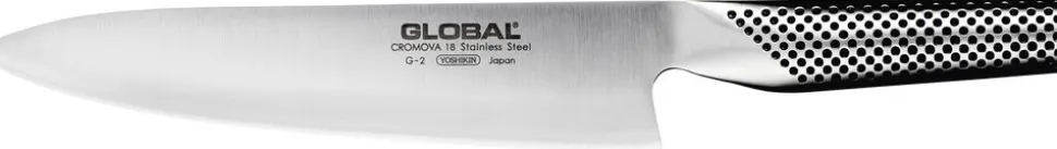 G-2 Chefkniv til alle former for udskæring. GLOBAL-knive er designet af Komin Yamada og fremstillet af YOSHIKIN-fabrikkerne Japan af det fineste CROMOVA 18 rustfrit stål, is-hærdet til Rockwell-hårdhed C56-58. Stålet holder sig skarpt længere end nogen anden type stål og modstår rust, pletter og anløbning. Hygiejniske, glatte former og et design uden samlinger forhindrer rester af mad og snavs. GLOBAL-kniven er kokkenes adelsmærke – både professionelle køkkenchefer og ambitiøse hus-gastronomer.