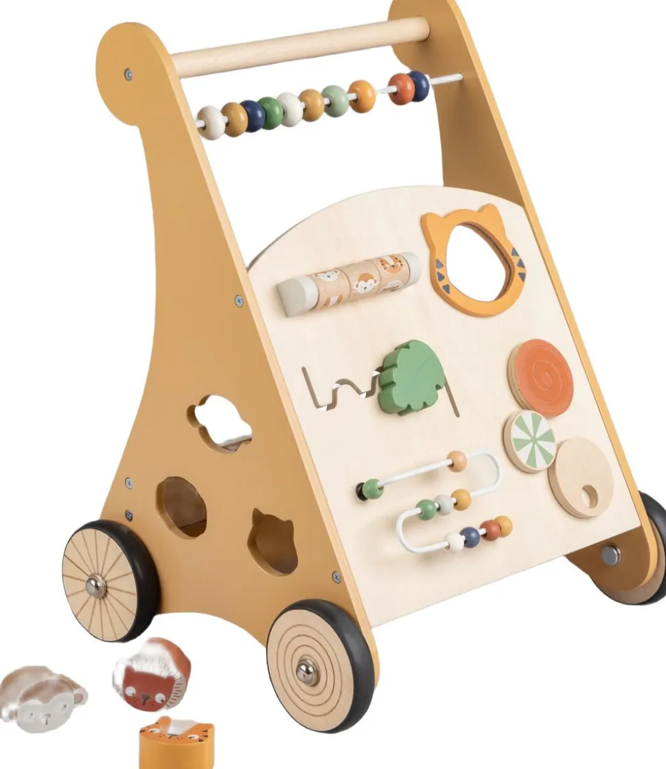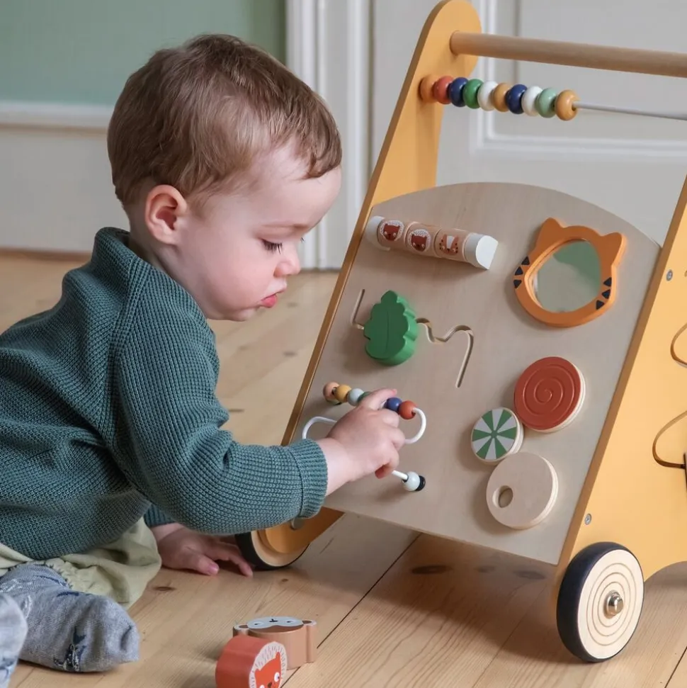 Vognen har 8 forskellige aktiviteter inkluderet. Tæl træperlerne på kuglerammen, få tre på stribe, eller se dig selv i det babysikre spejl. På den ene side af gå-vognen er der en indbygget putte-kasse, hvor de medfølgende træfigurer kan komme igennem de tilpassede huller.
