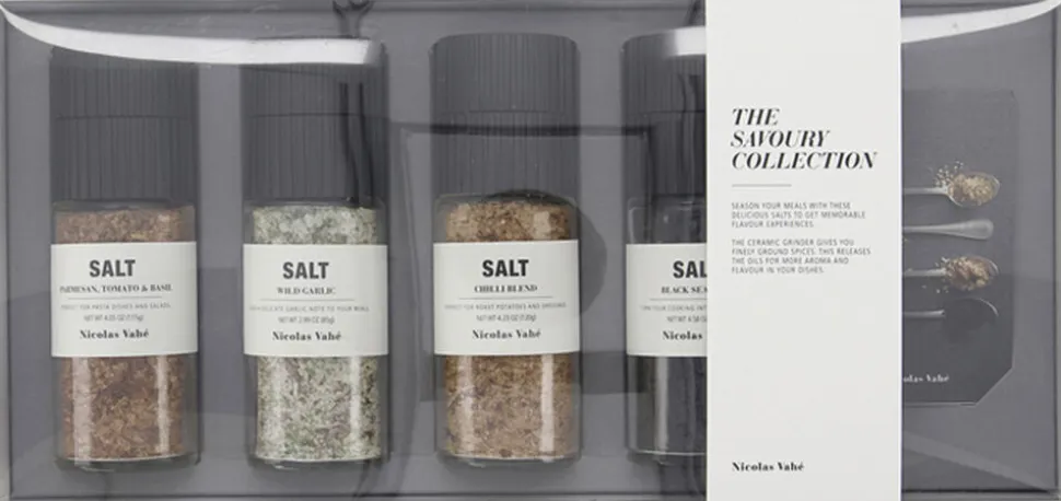The Savoury Collection er en gaveæske fra Nicolas Vahe, som fuldender ethvert måltid. De fire salte giver dine retter et boost med overraskende smage og gør dem til en fest for øjnene. Saltet med parmesan, tomat og basilikum er et must til italienske retter. Saltet med aktivt kul højner det visuelle udtryk med sin dybe sorte farve. Saltet med ramsløg giver din madlavning et delikat strejf med en afbalanceret hvidløgsnote. Til sidst giver saltet med chili dine retter en langvarig varme. Saltene leveres med keramiske kværne, der giver dig fint formalede krydderier. Dette frigiver olierne for mere aroma og smag i dine retter.