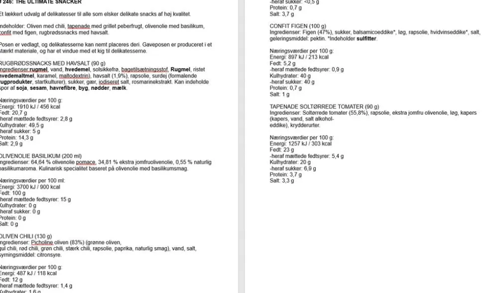 Et lækkert udvalg af delikatesser til alle som elsker skønne snacks af høj kvalitet. Indeholder: Oliven med chili, tapenade med grillet peberfrugt, økologisk ekstra jomfru olivenolie med rosmarin, confit med figen, rugbrødssnacks med havsalt samt et inspirationskort med en opskrift, hvor delikatesserne anvendes. Posen er vedlagt og delikatesserne kan nemt pakkes deri. Gaveposen er produceret i et stærkt materiale og har et vindue med et kig til delikatesserne.