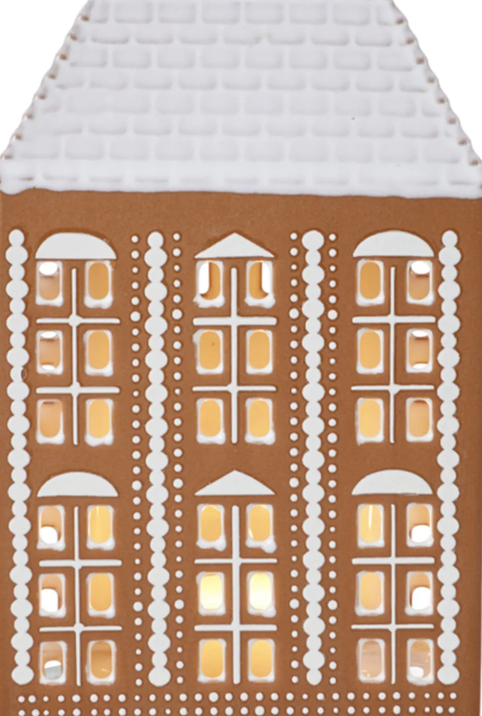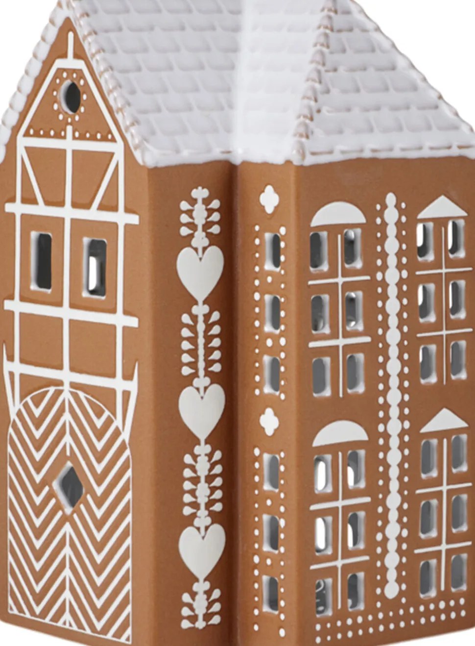 Kähler Gingerbread er en serie af håndlavede honningkagehuse, hvor Kählers keramiske ophav og den danske jul er sat på en fælles designformel. Dette honningkagehus emmer af jul, charme og traditioner og er med sine 17 cm i højden det største af honningkagehusene. Husets forside er belagt med et fint bindingsværkmønster, et cirkelformet og smukt dekoreret vindue og en stor port, der inviterer indenfor til masser af autentisk varme og hygge. Siderne på lyshuset er pyntet med store, hvide hjerter som symbol på den kærlighed, der ligger i hjerternes fest julen. Skab et hyggeligt julelandskab med nisser omkring husene eller brug dem alene som håndlavede designelementer, der med deres blanke og taktile glasur og den rå, uglaserede keramik vil stå smukt og sprede hygge. Gingerbread-lyshusene har en brun, mat yderside, der minder om honningkagedejen og er pyntet med hvide, blanke dekorationer og hvide tage, der ligner glasur. Og som en vigtig detalje er honningkagehusene hvidglaseret indvendigt, så det varme lys fra fyrfadslyset reflekteres og skinner ud. Store som små er de alle udskåret i hånden, og lyset fra husene skaber på denne måde legende klynger af lys og skygge omkring sig, hvor end honningkagehusene placeres.