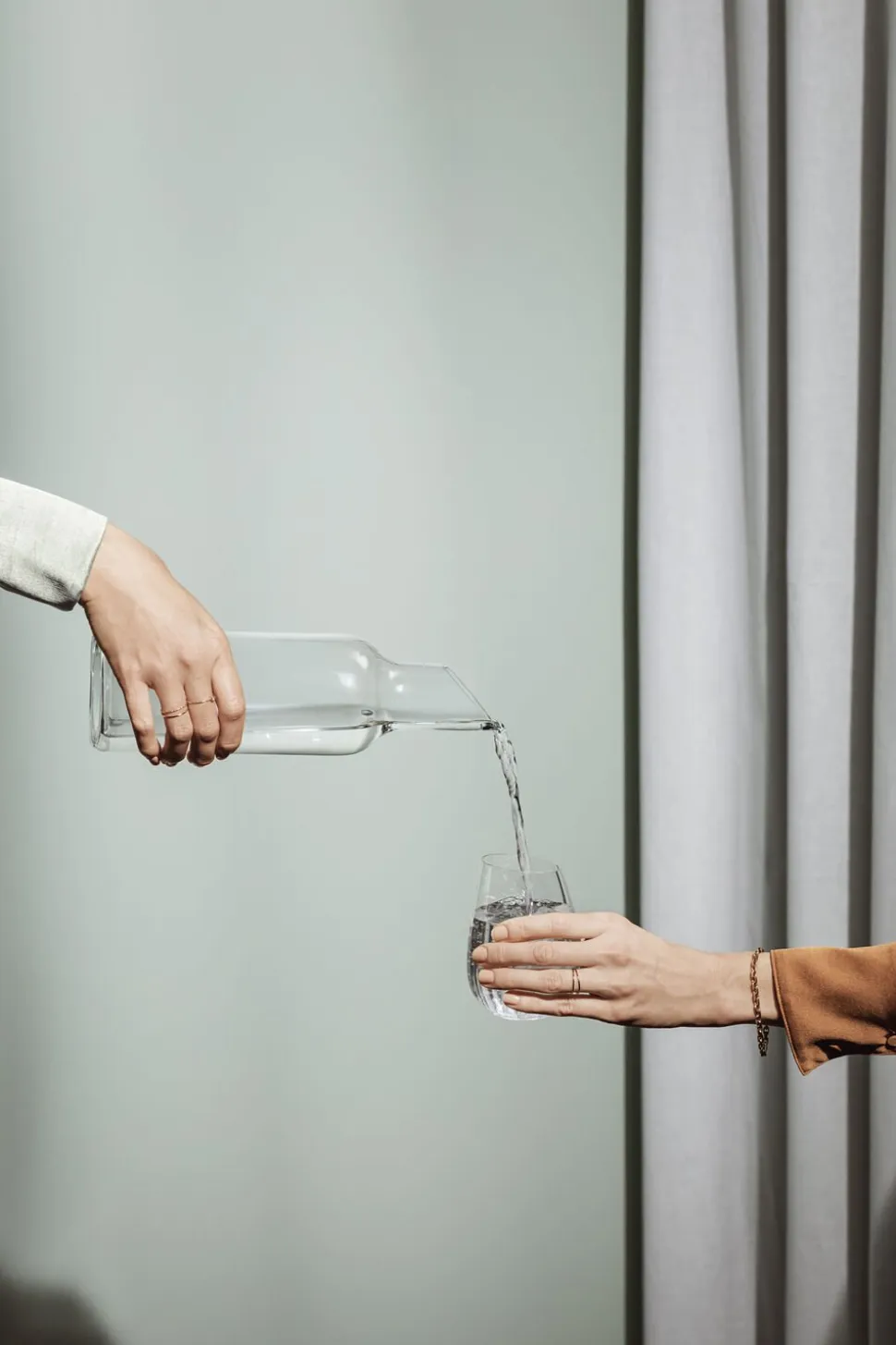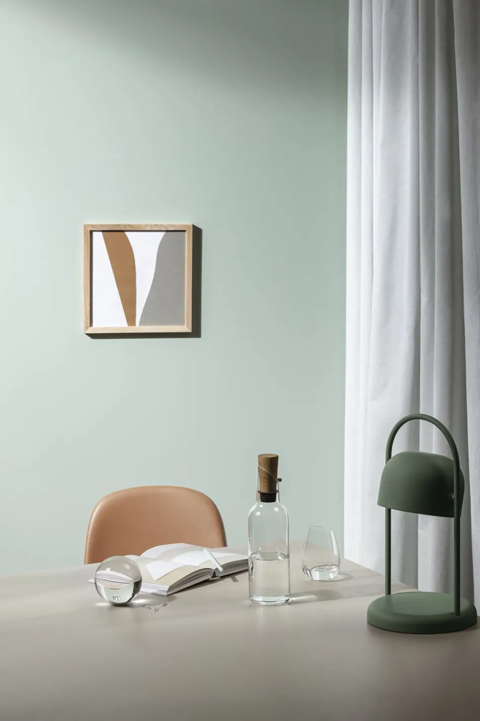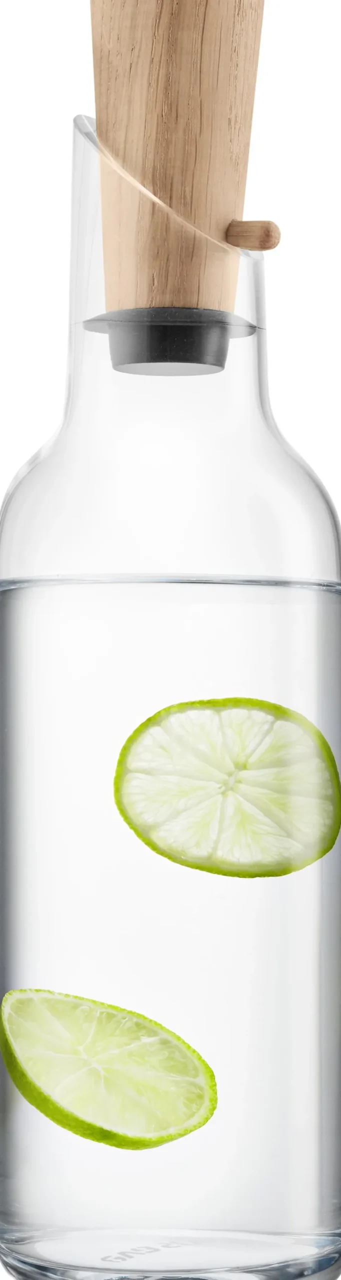 Tilfør spisebordet et nyt nordisk look med en elegant glaskaraffel, som med sit gennemtænkte design passer perfekt i køleskabsdøren. Den praktiske egetræsprop sikrer, at vandet ikke tager smag fra køleskabets indhold. Karaflen tåler maskinopvask og er derfor nem at rengøre. Proppen vaskes i hånden. Træ er et levende og organisk materiale, så der forekommer naturlige variationer. Vedligeholdes ved regelmæssig oliering.