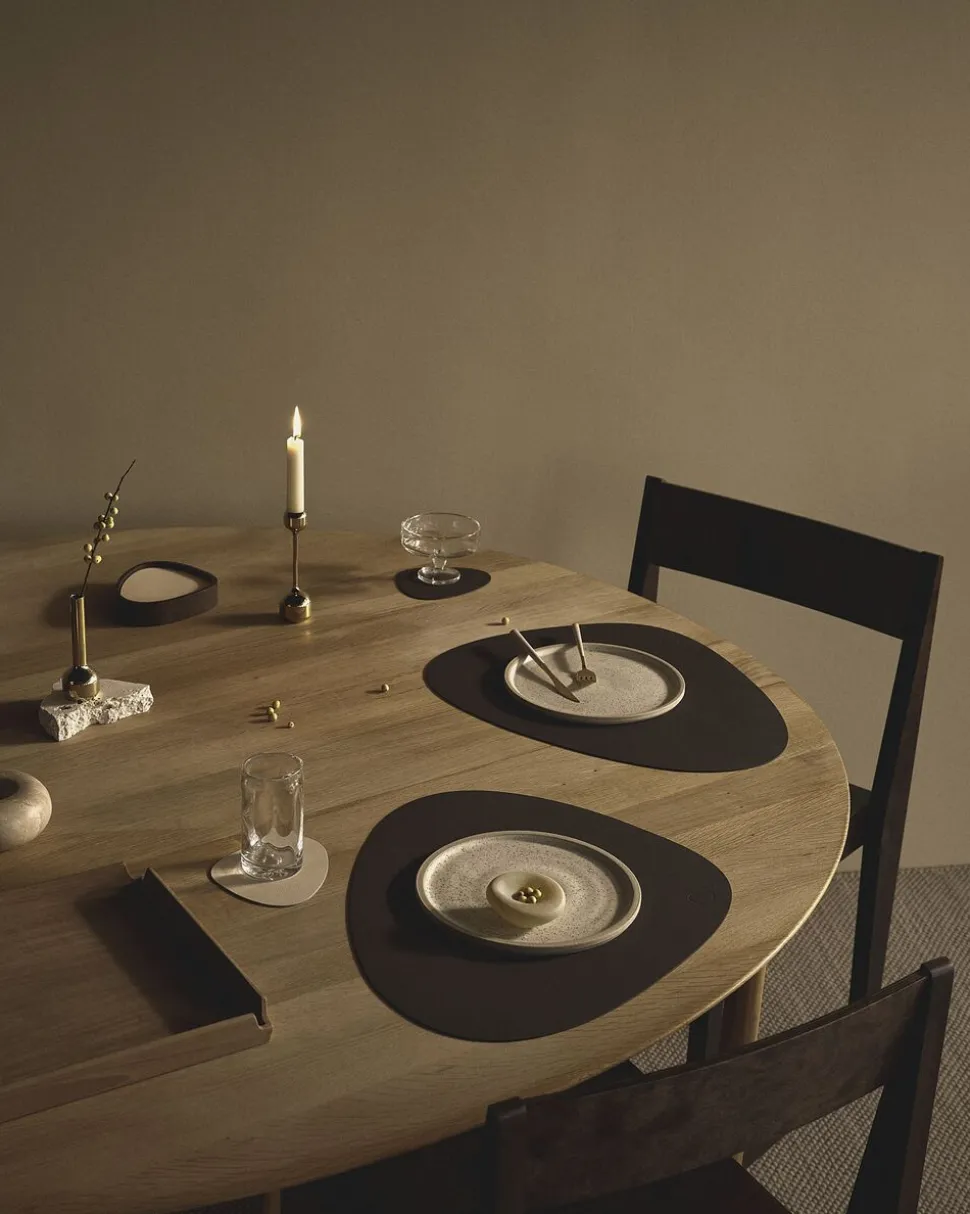 Den velkendte curve-form er blevet et moderne designikon, der bringer et blødt og organisk udtryk til borddækningen. Glasbrikkerne kombinerer funktionalitet og æstetik, så du både beskytter bordet mod mærker og samtidig tilføjer en dekorativ detalje. I den elegante nupo-lædertekstur fremstår glasbrikken med en mat og blød overflade, der tilfører et raffineret, underspillet look til både hverdags- og festlige borde.
