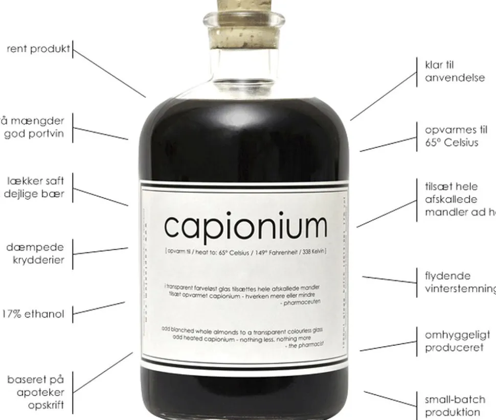 Capionium pharmaceut gløgg, small-batch. (fra flaske label):opvarm til 65° Celsiusi transparent farveløst glas tilsættes hele afskallede mandlertilsæt opvarmet capionium – hverken mere eller mindre- pharmaceutenAlkohol procent: 17%