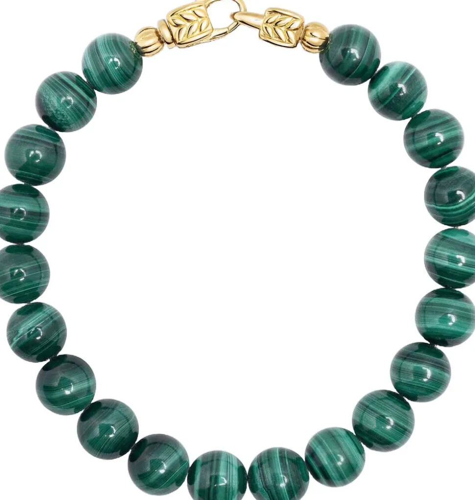 Herre Green Malachite Healing Bracelet med guldlås, 8mm Green Malachite Polerede Beads, 925 Sterling Silver Lobster Clasp med 18k Gold Plating, Lock med Signature Leaf Gravering. Håndlavet i Los Angeles