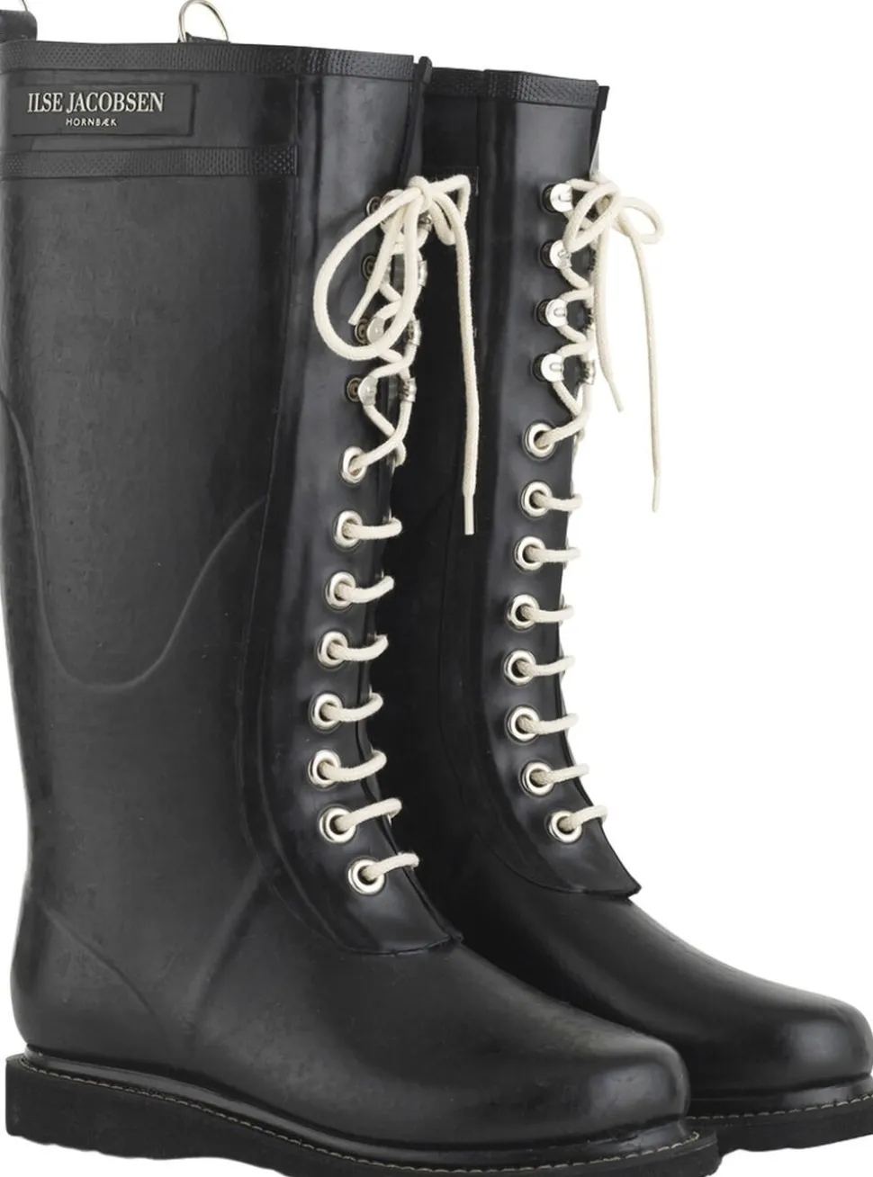 De ikoniske snørede gummistøvler fra Ilse Jacobsen er knælange gummistøvler med en dekorativ D-ring midt på ryggen og et logo på skaftet. Disse gummiringe er lavet af bæredygtigt høstet naturgummi og er blevet skåret i hånden. Dette materiale kan modstå temperaturer ned til -20 grader Celsius. Gummisammensætningen er 80 % ren, naturlig gummi og 20 % hemmelig formel. Vores støvler er helt PVC-fri og indeholder ingen animalske biprodukter. Hvis det ikke behandles regelmæssigt, vil naturgummi udvikle en hvid overflade i årenes løb på grund af tabet af æterisk Olie. For at holde dine støvler i god stand i mange år fremover, anbefaler vi at behandle dem en gang om måneden med vores Olie. Nye snørebånd fås i flere farver