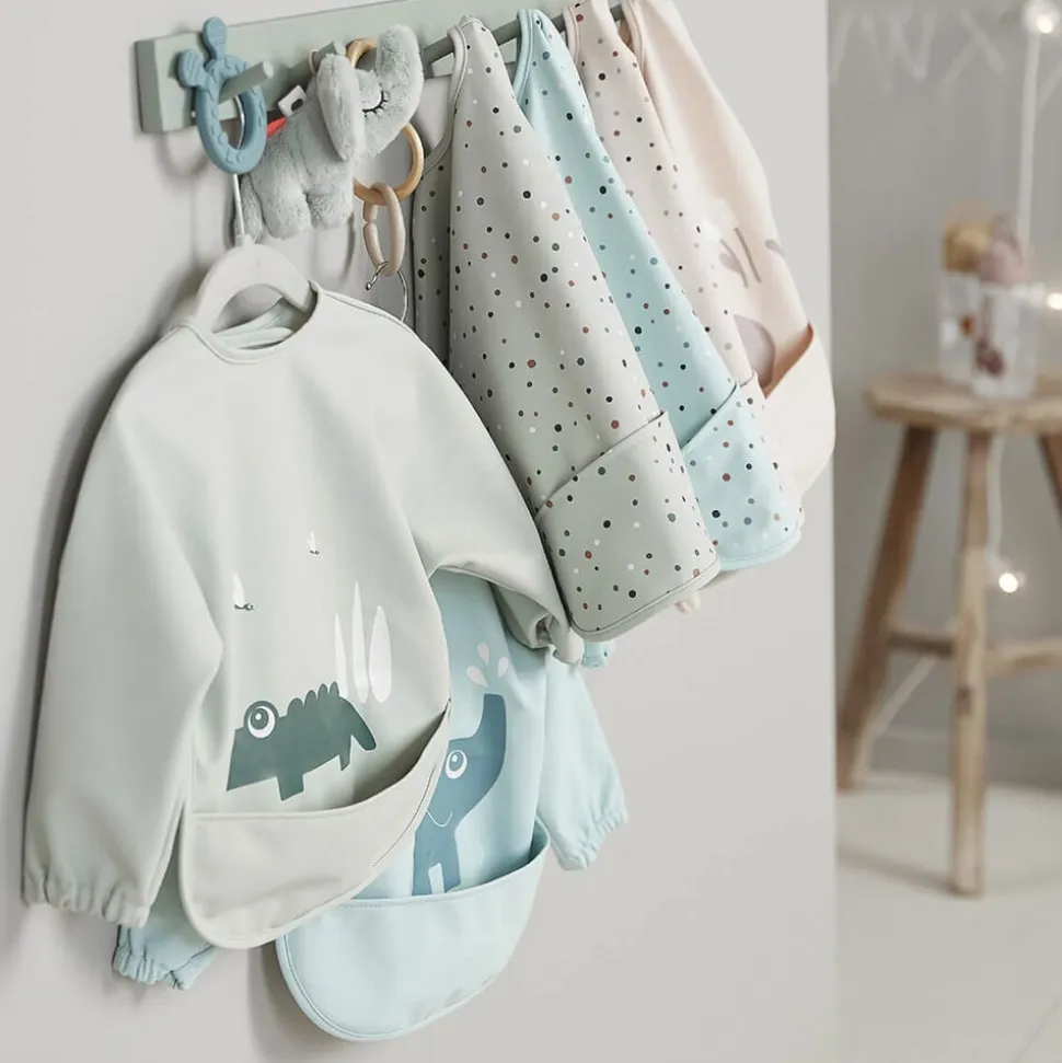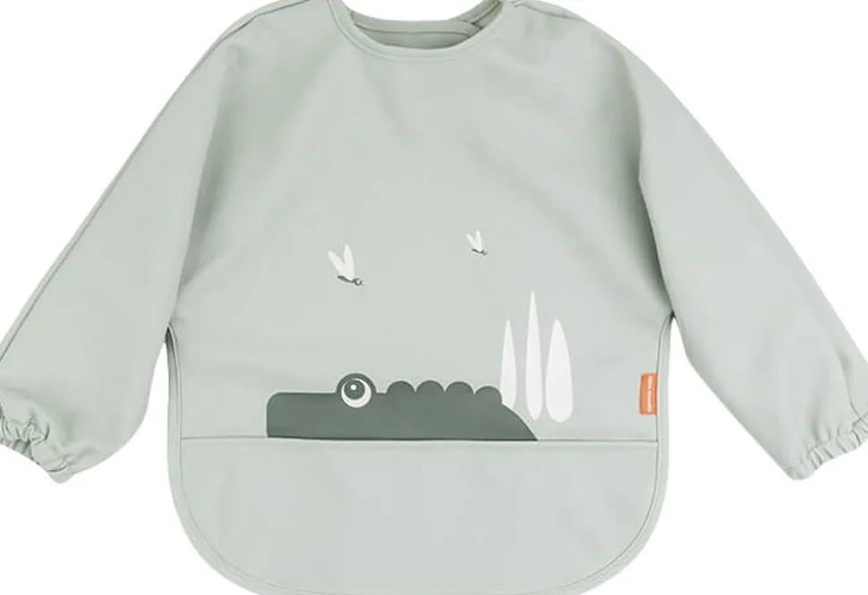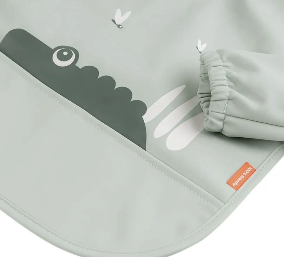 Hagesmækken med lange ærmer og en lomme vil beskytte dit barns tøj ved spisetid eller når I leger med maling, modellervoks eller andre kreative sager. En justérbar dobbelt-lukning sikrer, at hagesmækken passer til både babyer og tumlinger. Den bløde hagesmæk er vandtæt og har praktiske ærmer med elastik, der holder de små tørre. Den er nem at tørre af og holde ren, hvilket sparer dig for en masse vasketøj. Den søde grønne hagesmæk er dekoreret med Croco og ildfluer.