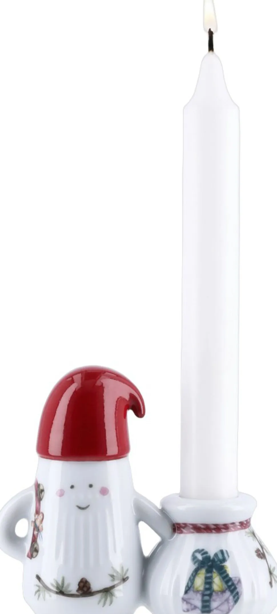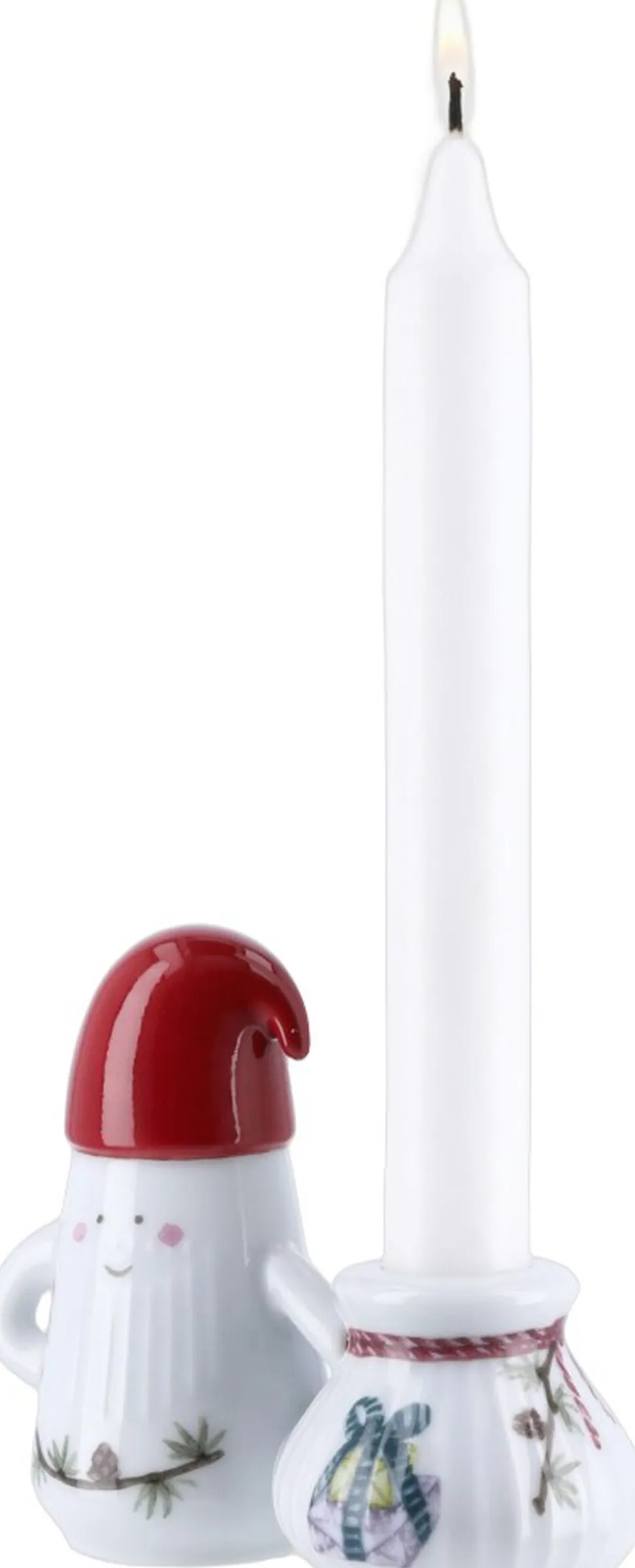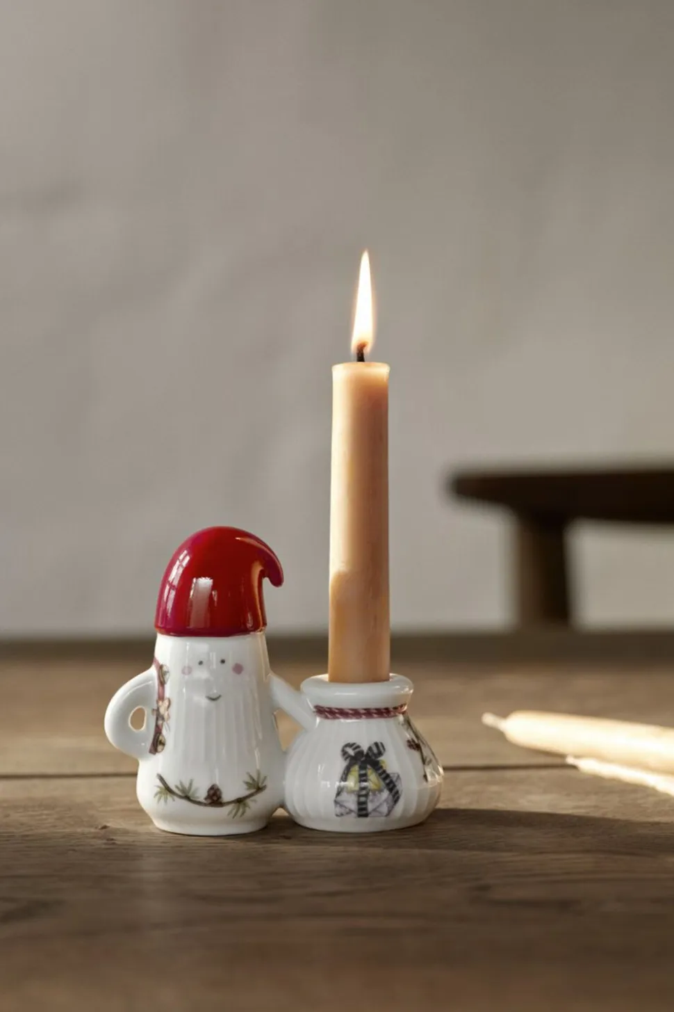 Juletraditioner og håndværkstraditioner i skøn forening. Med den lille nissefamilie med gaver fra Kählers juleserie Hammershøi Christmas bringer du julestemningen ind i boligen med glade smil og søde julemotiver i et skulpturelt og markant design, du kan mærke autenticitet og kreativt håndværk formet af tradition. Hammershøi Christmas-nissefar med gavesæk som lysestage er udformet i bløde linjer med Hammershøi-seriens ikoniske riller, der kendetegner Hans-Christian Bauers stel og bordpynt. Figuren måler 10 cm i højden og er foruden den ikoniske cedergren med lærkekogler dekoreret med en lanterne, så han kan finde vej, og om skulderen hænger en bjælderanke, så du kan høre, når Nissefar kommer med dine gaver. Nissefar elsker småkager, så på ranken sidder også en peberkagemand som en lille lækkerbisken til turen rundt med gavesækken, der har plads til et kronelys i toppen. Ingen nisse uden nissehue. Og derfor har nissefar selvfølgelig også den sødeste håndmalede nissehue i ægte nisserød, der for ægte Hammershøi Christmas-fans nok vil virke ret bekendt med sit karakteristiske buk ud til siden. Den er nemlig ligesom alle de andre motiver i serien skabt og malet i akvarel af kunstner Rikke Jakobsen i den velkendte hyggelige og håndmalede stil og herefter overført til det snehvide porcelæn med en særlig teknik. Hammershøi Christmas-nisserne er sammen med figuren med gavestakken autentisk dansk design, der kan gøre spisebordet mere levende, fortælle nye historier i vindueskarmen og fremhæve dit hjems skønhed fra en simpel hylde i reolen. For ligesom julen er også Kähler formet af tradition. Med Kählers juleserie Hammershøi Christmas kan du dække op til alle decembers sammenkomster fra brunch og frokost til julemiddag og æbleskivehygge, og det er oplagt at invitere de søde nisser med til bords, hvor de vil skabe stemning og hygge. Og har du lagt mærke til en helt særlig både finurlig og funktionel designdetalje? Nissefiguren står stolt med armene i siden, så der dannes et lille hul omkring albuerne perfekt til at binde et flot bånd på og måske ovenikøbet vedhæfte dekorative bordkort til dine julegæster. Eller hvis du tør! Binde ham sammen med nissemor eller seriens anden nissefar så de kan stå som det sødeste lille nissepar. Enkelt, elegant og kreativt. Skabt af kreative og omhyggelige hænder. Fordi Kähler gør indtryk med sit tydelige aftryk.