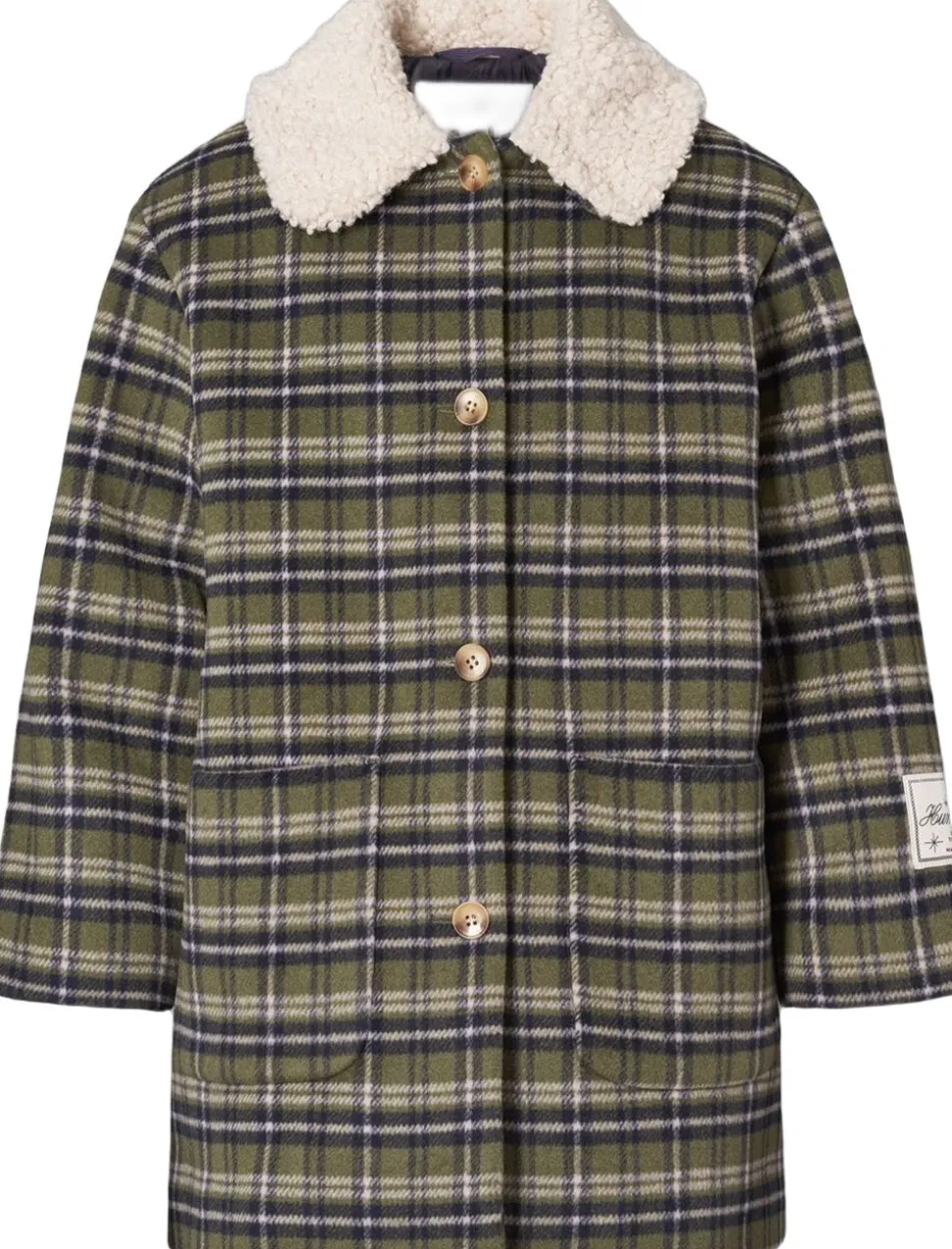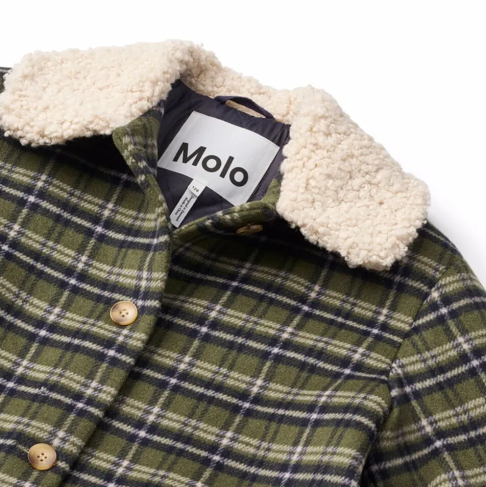 Denne knælange ternede jakke fra Molo er lavet i genanvendt polyester og uld i blå, grønne og hvide nuancer. Jakken har en løs pasform, en lys krave i teddyfleece, frontlommer samt knaplukning med fine brune knapper. Den har et quiltet foer, der gør den behagelig at have på.