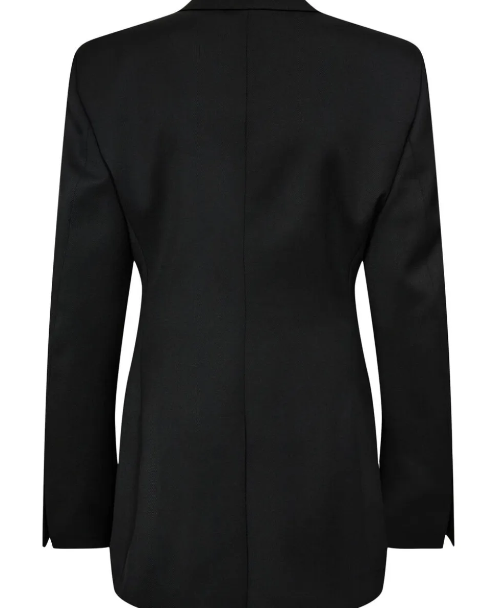 Single ammende blazer. Skræddersyet konstruktion. Monteret på wai st. To knapper foran. Brystlomme. Jettede klaplommer. Knapper ved ærmemanchetter. Vent midt bagpå. Indvendig lomme. Fuldt foret.