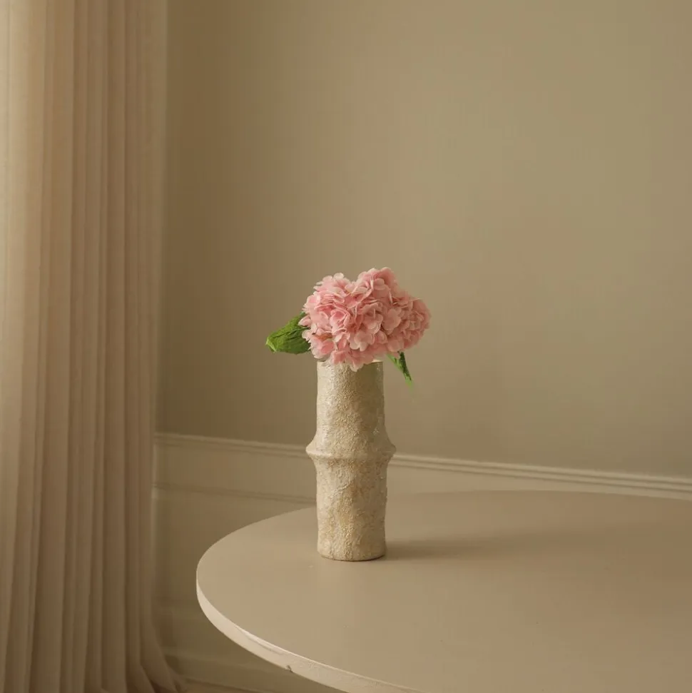 Denne lyserøde Hydrangea blomsterstamme har en Single stor blomst med bløde, pastelrøde kronblade, der danner en tæt, afrundet klynge. Kranserne viser subtile variationer i nuance, hvilket skaber en naturlig gradienteffekt. Blomsten er ledsaget af teksturerede, dybe grønne blade med savtakkede kanter, fastgjort til en robust, lysegrøn stilk og når en højde på 49 cm. Den store keramiske jordvase på billedet måler 30,5 cm i højden og 10 cm i diameter.