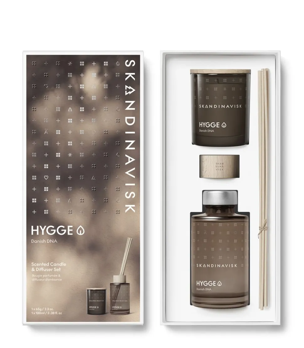 Duftnoter: Sort te og mynte blade, tørrede æbler og et lille drys bagt kanel. Fyld dit hjem med den omfavnende varme fra dansk hygge. Et duftsæt med duftlys og rumspray til enhver lejlighed. HYGGE – Dansk for hygge. Et ord der ikke kan direkte oversættes, men med uendelige betydninger og en refleksion af den Skandinaviske måde at skabe intimitet, fælleskab og hygge.