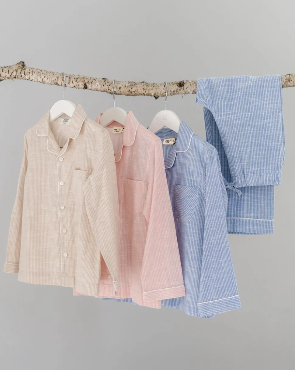 Pyjamas fra Magasin du Nord Collection i den blødeste kvalitet af 100% økologisk bomuld med GOTS-certificering. Sættet består af en langærmet skjorte og et par bukser med et fint, stribet mønster, ’piping’-detaljer samt en løs pasform. Bukserne har sidelommer samt elastik og snøre i taljen. Skjorten har en enkelt brystlomme, en åben krave samt knaplukning på fronten. En skøn pyjamas i den absolut lækreste kvalitet.