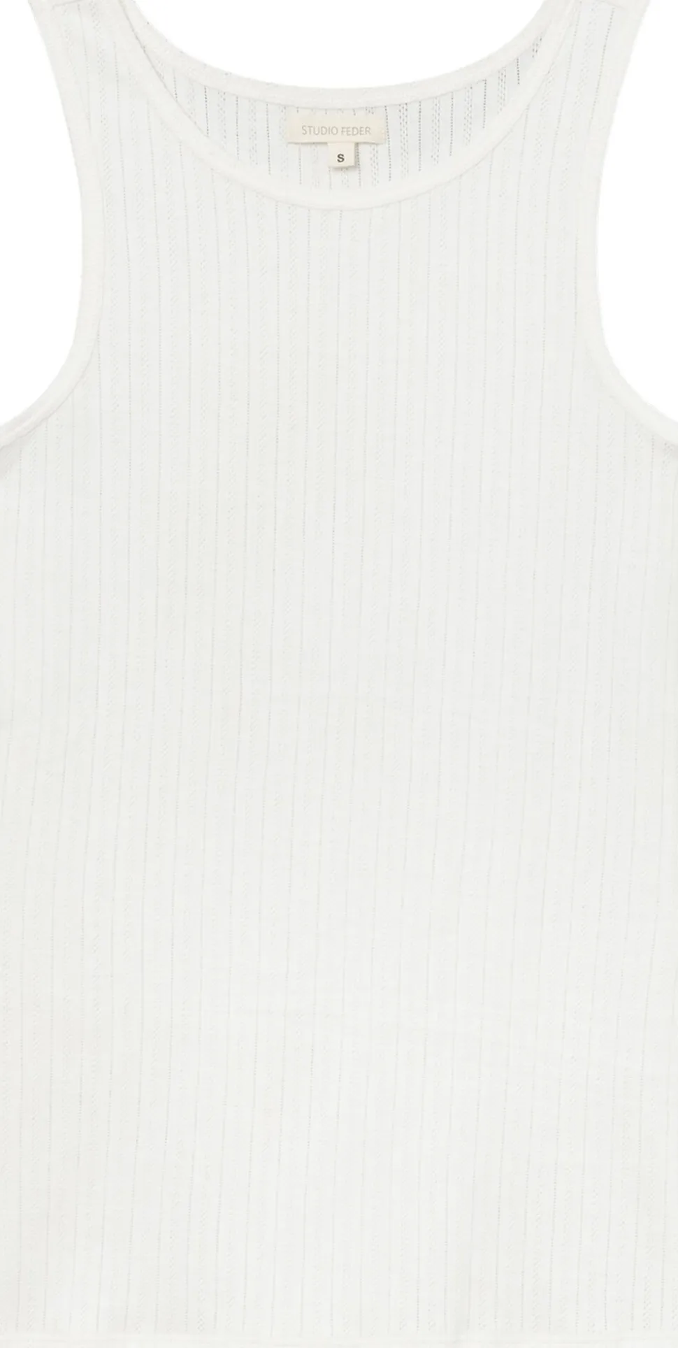 Smuk og enkel pointelle top i 100% økologisk bomuld. Toppen har rund hals og hulmønster, samt indvendige syninger med franske sømme for en delikat, luksuriøs finish. Brug toppen som et ekstra lag og lad gerne kanten stikke frem, så man kan se mønsteret. Toppen kan også bruges under en åbenstående blazer eller skjorte, som en del af et feminint og afslappet look.